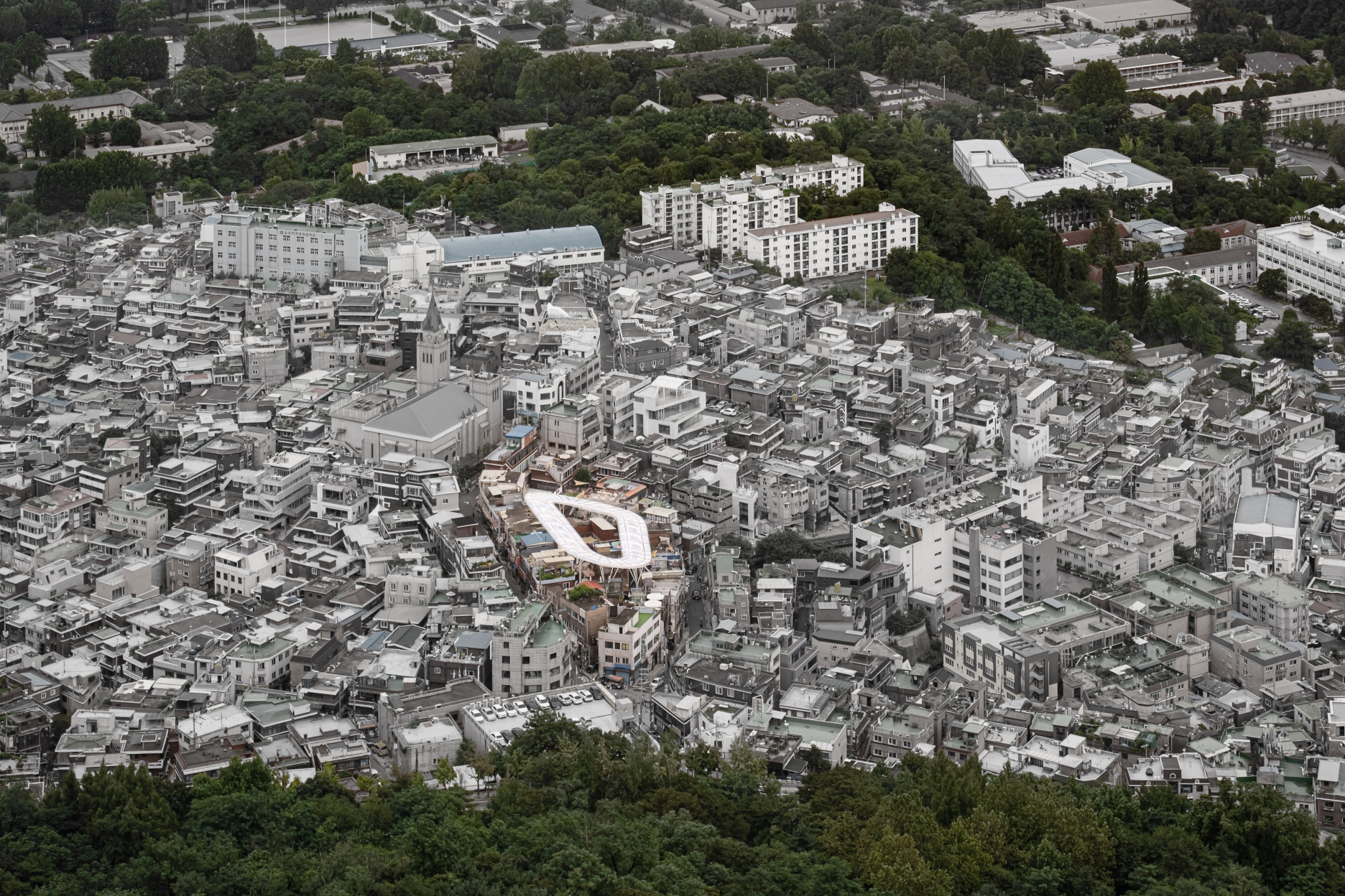 서울 남산 자락 아래, 롤러코스터를 닮은 둥근 구름 모양의 구조물이 눈길을 사로잡는다. '클라우드'라는 이름의 이 건축구조물은 해방촌 신흥시장의 새로운 지붕이다. 낮에는 자연광을 부드럽게 끌어들이고, 밤에는 다채로운 조명을 밝히며 활력을 불어넣는 '클라우드'는 위진복+홍석규 두 건축가의 손에서 탄생했다.