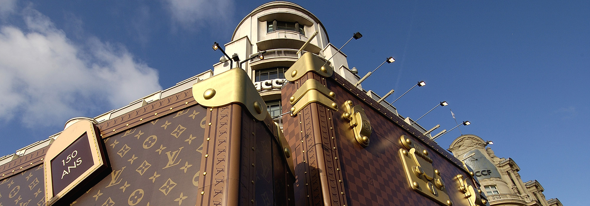 건물이 공사에 들어가면 일반적으로 높은 곳에서 일할 수 있도록 임시적으로 설치하는 가설물인 비계가 세워지고, 그 위에 가림막이 설치되어 지저분해 보이는 공사 현장을 가리기 마련이다. 효율적인 방법이지만 몇 개월, 몇 년 동안 이루어지는 공사 기간을 생각하면 가림막으로 채워지는 공간이 아쉽다. 그래서 루이비통은 여기에서 더 나아가, 다양한 크기의 트렁크 6개가 쌓인 모습을 연출하며 사람들의 이목을 집중시켰다.