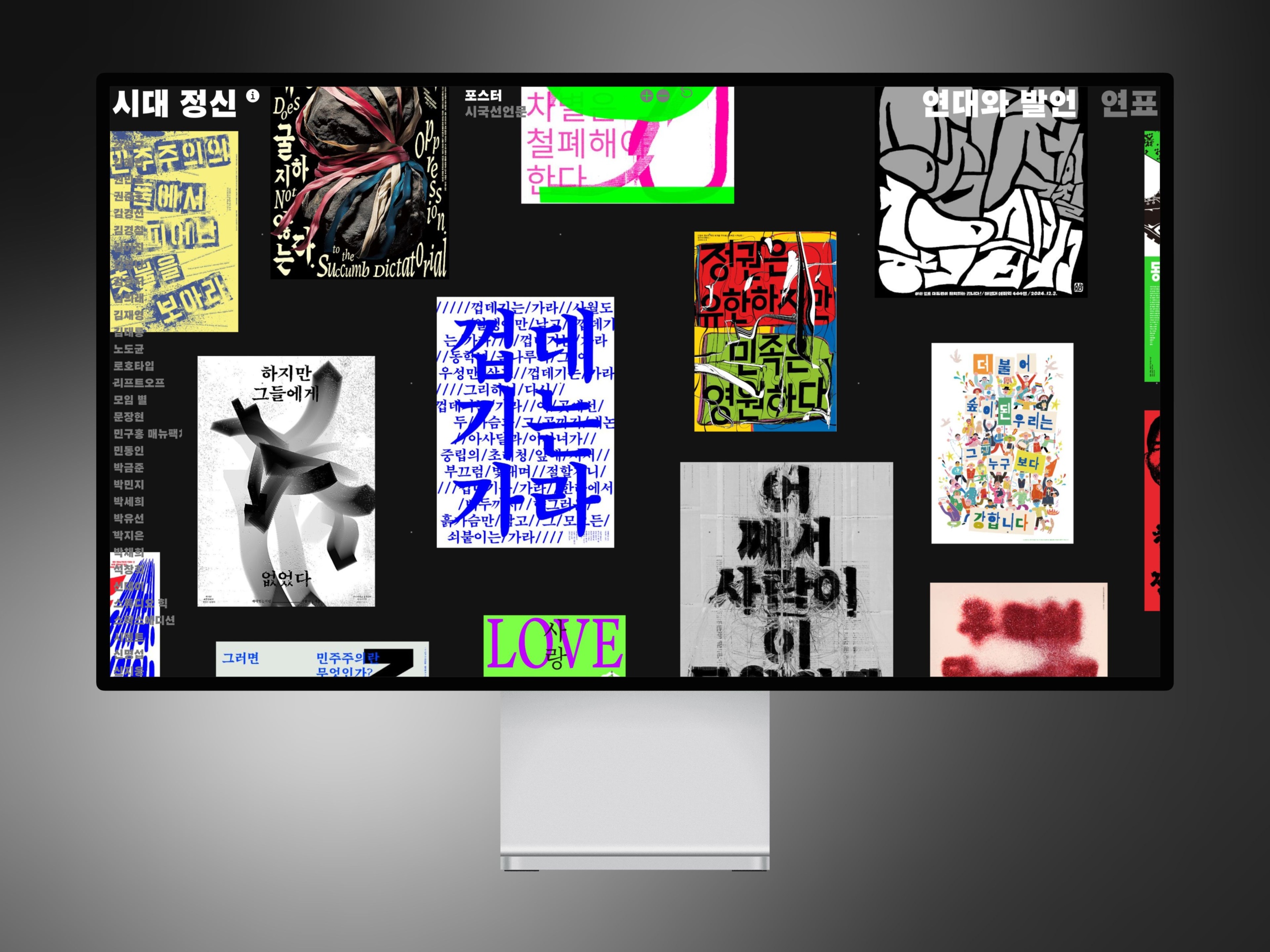 지난해 12월 3일 우리는 민주주의가 무너지는 모습을 목도하며 불면의 밤을 보냈다. 8년 전 탄핵이 무색할 만큼 혼란의 역사가 반복되고 있었다. 가만히 기다릴 수 없었다. 1차 탄핵안이 부결되자 행동으로 실천해야겠다는 의지가 뚜렷해졌다. 일상의실천이 기획한 ‘시대 정신’은 정치의 근간이 송두리째 흔들리는 장면을 실시간으로 마주한 디자이너들이 민주주의의 회복을 위해 참여한 프로젝트다. 돌이켜보면 한국 사회는 군부독재 정권부터 지금까지 정치사회적 위기를 극복하며 민주주의의 기반을 다져왔다. 역사적 분기점마다 부당한 권력에 저항한 시민들이 있었고, 그들의 목소리는 시국 선언문이라는 텍스트로 기록되었다. 안타깝게도 과거 시국 선언문에서 엿보이는 민주주의의 위기는 현재의 그것과 크게 다르지 않다. 연도와 배경을 덮어둔다면 2025년이라고 해도 믿을 법하다. 우리는 어쩌면 역사에서 교훈을 얻지 못했기에 어리석은 역사를 반복하는 게 아닐까? 일상의실천은 민주주의의 타임라인을 다시 한번 되짚어보자는 취지에서 1960년대부터 2024년까지 발표된 시국 선언문을 아카이빙하고 이를 재구성해 디자인계의 시국 선언을 발표했다. 63팀의 참여 작가들은 시국 선언문의 단어나 문장을 발췌해 포스터를 디자인했다. 프로젝트의 목표는 명확했다. 훼손된 민주주의의 가치를 회복하는 것. 다만 디자이너이기에가능한 방식으로 목소리를 전달하고자 했다. 단순히 시국 선언문을 인용하는 작업이 아닌, 시각적 재해석을 통해 개인의 메시지와 역량을 드러내며 오늘날 디자이너의 책임과 역할은 무엇인지 반추하고자 했다. 프로젝트를 주도한 일상의실천 권준호 공동 대표는 지금 한국 사회가 분열되어 있는 만큼 ‘시대 정신’이 성별과 세대를 아우르는 통합의 장이 되길 의도했다. 무엇보다 민주주의의 의미가 퇴색되지 않는 방식을 고민했다. 특정 정권이 퇴진하고 조기 대선이 시작되면 민주주의 시스템에 대한 고민과 성찰은 휩쓸려가고 더 극단적인 정치 양극화를 마주할 수 있기 때문이다. 단순히 정권 퇴진을 촉구하기보다는 절차적 정의 위에 세워지지 않은 민주주의가 어떤 위험성을 갖는지, 시대 정신이 흔들릴 때 권력이 어떻게 남용될 수 있는지 되돌아보고자 했다. 프로젝트의 기획자와 참여자들이 전달하고자 한 민주주의는 완전하거나 완성된 체계가 아니다. 모두가 계속해서 가꾸어나가야 할 제도로, ‘시대 정신’은 그 과정의 일부로 유의미한 기록이 될 것이다.