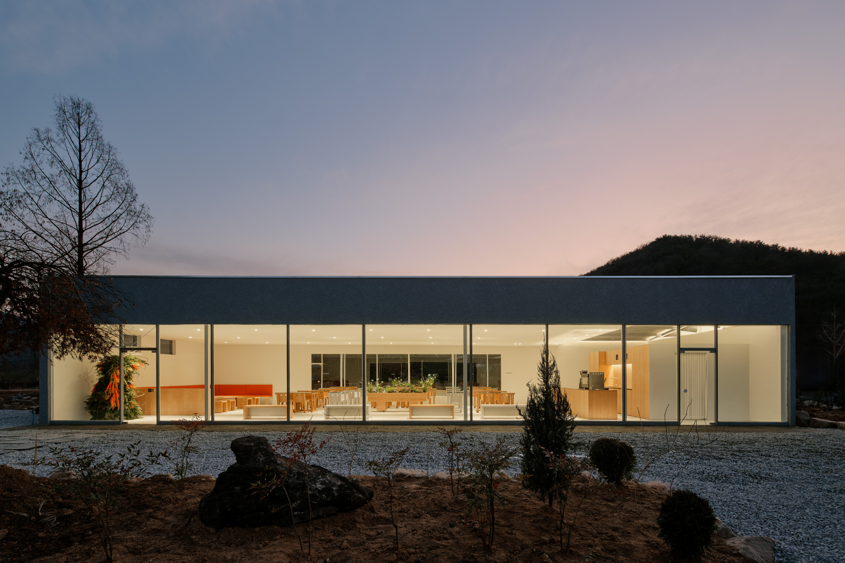 내부는 백색, 유리, 스테인리스 같은 반사 재료로 마감해 자연과 인공 사이의 경계를 허문다. 외부 풍경이 마감재에 스며들어 외부의 자연을 내부로 담은 건축이 완성된다. 나무 소재는 공간의 온기를 더하고, 수평으로 펼쳐진 마당은 진입과 머무름, 그리고 지난 기억을 되새기게 하는 흐름을 유도한다.