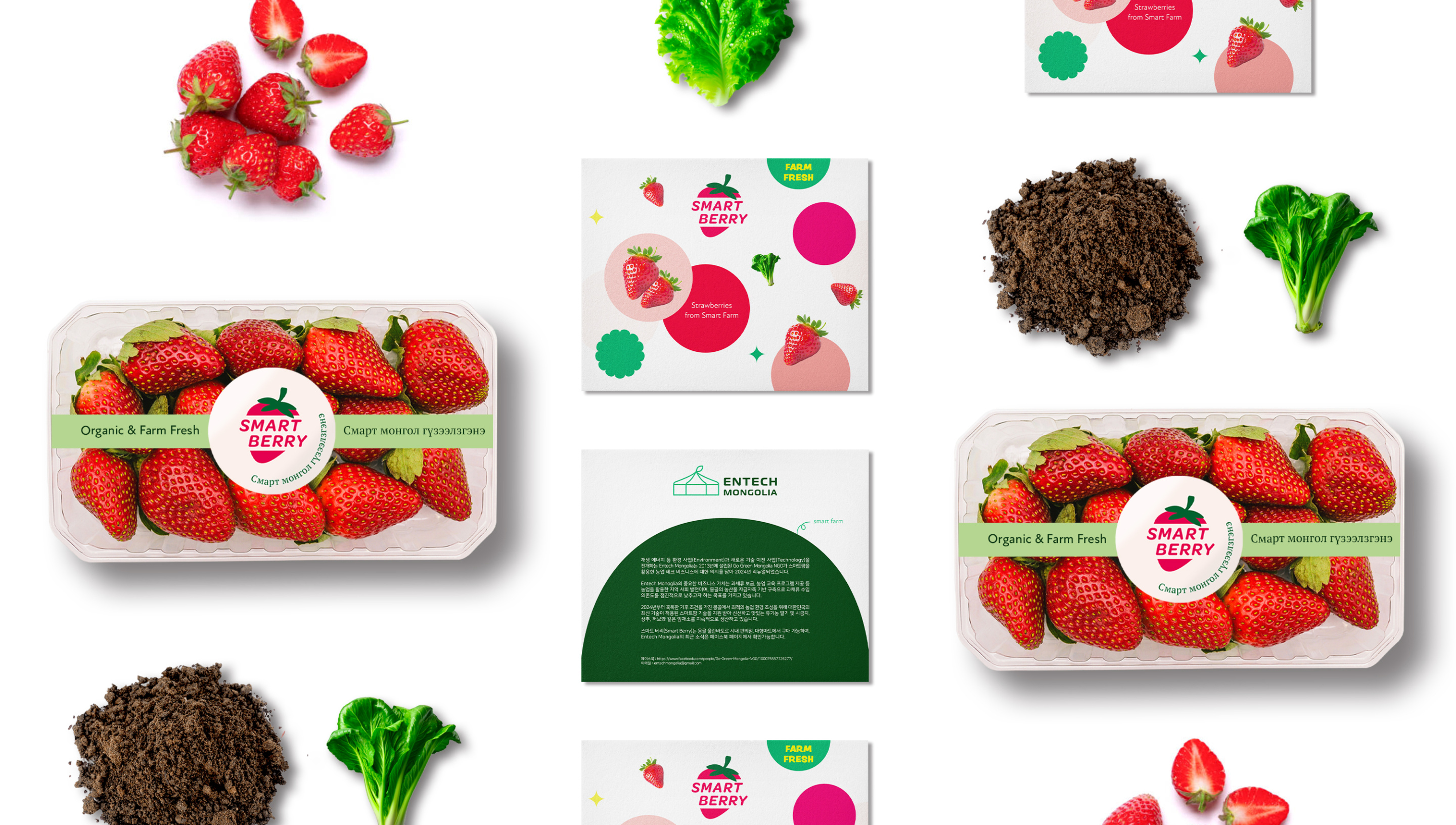 스마트팜에서 재배될 첫 농산물인 딸기는 스마트 베리(SMART BERRY)라는 브랜드로 론칭된다. 단순한 과일이 아닌 프리미엄 브랜드로서 자리 잡기 위한 전략적 네이밍으로, 썬키스트(Sunkist)의 오렌지나 제스프리(Zespri)의 키위처럼 몽골 내 대표적인 과일 브랜드로 성장하는 것을 목표로 한다. 딸기 형태 속에 ‘SMART BERRY’ 타이포그래피를 결합한 도형 타입의 로고를 만들어 소비자들이 직관적으로 브랜드를 인식할 수 있게 도와준다.