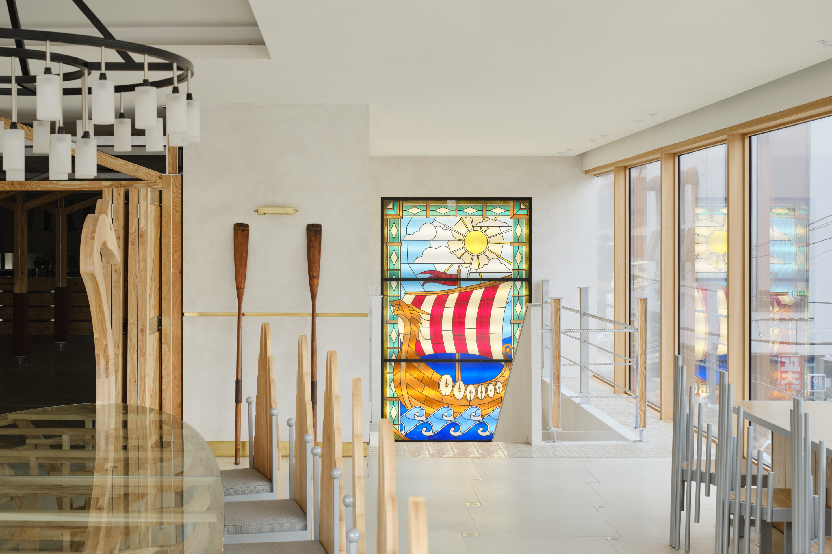 1층에서는 바이킹 그래픽이 손님을 맞이하는 걸로 시작해요. 2층으로 올라오는 계단에는 바다에 떠 있는 바이킹의 배를 표현한 스테인드글라스가 설치되어 있는데요. 공간에 대한 힌트를 시각적으로 조금씩 알려주는 거죠.