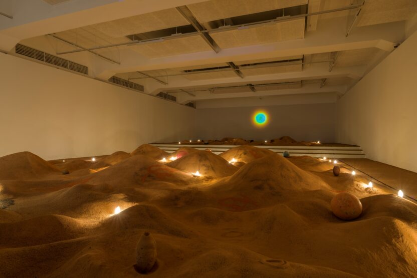 이번 전시 <하이퍼 옐로우>는 2015년 삼성미술관 플라토에서 선보인 전시 <만일(萬一)의 약속>(2015) 이후 국내 미술관에서 10년 만에 개최됐다. 그간 작가가 작업을 지속하며 맞이한 전환점을 선보인다. 특히 일본 오바야시 재단의 리서치 그랜트(‘도시의 비전’, 2023)를 계기로 한국과 일본을 오가며 수행한 연구를 소개한다. 전시 제목인 ‘하이퍼 옐로우’는 ‘옐로우를 초과한 상태’를 의미한다. 인종적 함의를 내포한 ‘옐로우’라는 단어와 동북아시아 삼국인 한국, 일본, 중국을 잇는 ‘황해(黃海)’의 의미를 연결시키며 논의를 확장한다. 작가는 이번 전시를 통해 황해를 통로로 형성된 문화의 복잡한 면면을 유적, 사료, 의례와 종교의 흔적으로 정교히 짚어본다. 즉, ‘하이퍼 옐로우’는 그 결과가 과거-미래를 순환하는 이미지에 이른 형상, 이를 토대로 현실의 임계점을 넘으려는 작가만의 독특한 미학인 셈이다.