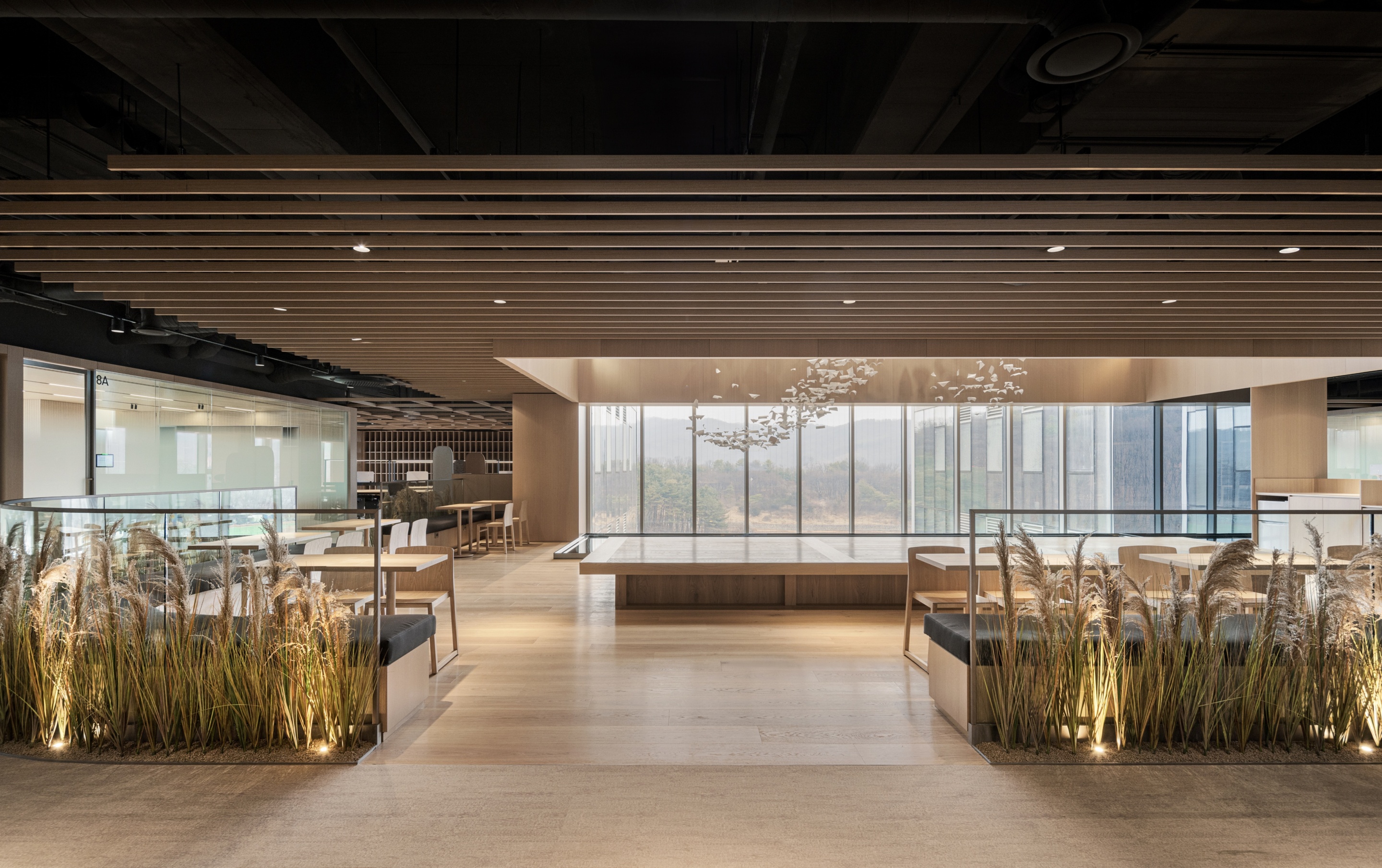이번에는 ‘두 번째 집’이라는 콘셉트로 사무 공간을 디자인했다. 이 접근법의 핵심은 ‘배움이 있는 마을’이란 교촌의 사명에서 착안한 커뮤니티 중심 디자인이다. 논스페이스는 하루의 약 3분의 1을 체류하는 사무 공간을 편안한 공동체 공간으로 만들고자 했다. 이러한 발상은 다양한 공간 구성 방식으로 표현된다. 예를 들어 한 층의 중심부에 자리한 탕비 공간은 전통적인 마을에서 상징적인 소통 공간이었던 정자나무 앞 광장을 재해석한 결과물이다. 포토 스튜디오, 테스트실, 타운 홀 공간, 라운지 등 사용 빈도가 높은 공간들을 하나로 묶어 구성원들이 자연스럽게 만나고 소통할 수 있는 환경을 조성했다. 8층 메인 라운지는 여기서 한 걸음 더 나아갔다. 수공간 앞에 언제든 걸터앉아 대화를 시작할 수 있는 대청마루를 배치했으며, 천장에는 정자나무를 현대적으로 재해석한 흰색 오브제를 설치했다. 이는 조직 문화의 중심지임을 강조한 것이다.