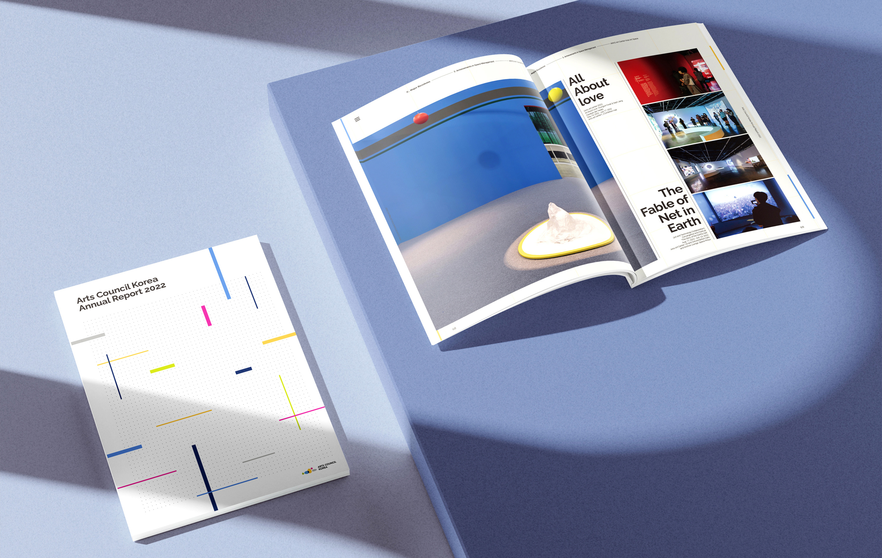 연차 보고서는 기업·기관의 성과와 책임을 기록하는 중요한 문서이지만, 매년 반복되는 제작 과정과 방대한 정보를 담아야 하는 특성상 형식적이고 경직된 모습인 경우가 많다. 바이제이디자인그룹이 디자인한 〈한국문화예술위원회 2022 연차 보고서〉는 바로 이 지점에서 새로운 시도를 보여준다. ‘예술의 확장’이라는 기관의 미션을 편집 디자인에 녹여내며 보고서의 정형성에 균열을 가한다. 보고서를 단순한 정보 서류가 아닌 한국문화예술위원회가 선보이는 또 하나의 무대로 접근했다. ‘전시회’라는 콘셉트를 설정하고 페이지마다 독자가 새로운 전시 공간과 의미 있는 정보를 탐색하는 경험을 만들고자 한 것. 이에 기관의 여섯 가지 상징 색을 입힌 선을 지면 곳곳에 자유롭게 배치했다.