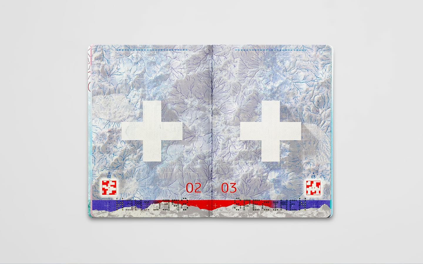 스위스 기업 레티나(RETINAA)가 주도하여 제작한 여권에는 알프스 봉우리에서 계곡까지 이어지는 여정을 도식화한 부조, 수문학을 바탕으로 스위스의 주요 수역·강의 흐름·지하수 등을 묘사한 지도, 전통 광물인 수정을 형상화한 3D 워터마크 등이 조화를 이루며 여권 그 자체로 스위스를 여행하는 듯한 감각을 선사한다. 여기에 자외선 반응 잉크를 활용한 기술은 여권이라는 인쇄물에서 인터랙티브한 경험까지 제공한다. 자외선 빛 아래에서 숨겨진 윤곽선과 건축적인 랜드마크를 볼 수 있기 때문이다.