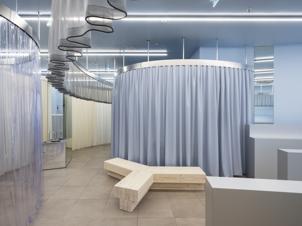 매장 곳곳에 드리워진 커튼은 아트 스쿨에서 세노그라피를 전공한 곤잘레스가 즐겨 사용하는 아이디어다. 마치 무대처럼 신비로운 느낌과 궁금증을 유도할 뿐만 아니라 고객이 갈 수 있는 곳과 아닌 곳을 분리하는 기능적인 역할도 수행한다. 라이트 블루 컬러의 벽과 이어지는 커튼 그리고 상단에 떠있는 하얀색 커튼은 하늘에 떠있는 구름을 표현하며 공간에 깃든 스토리텔링의 암시를 준다. 또한 알루미늄 소재의 테이블들은 조명을 반사해 안경을 더욱 돋보이게 해준다. 고객과 직원이 만나는 카운터만 나무 소재를 사용한 것도 따뜻한 소통을 의미하는 의도된 연출이다.