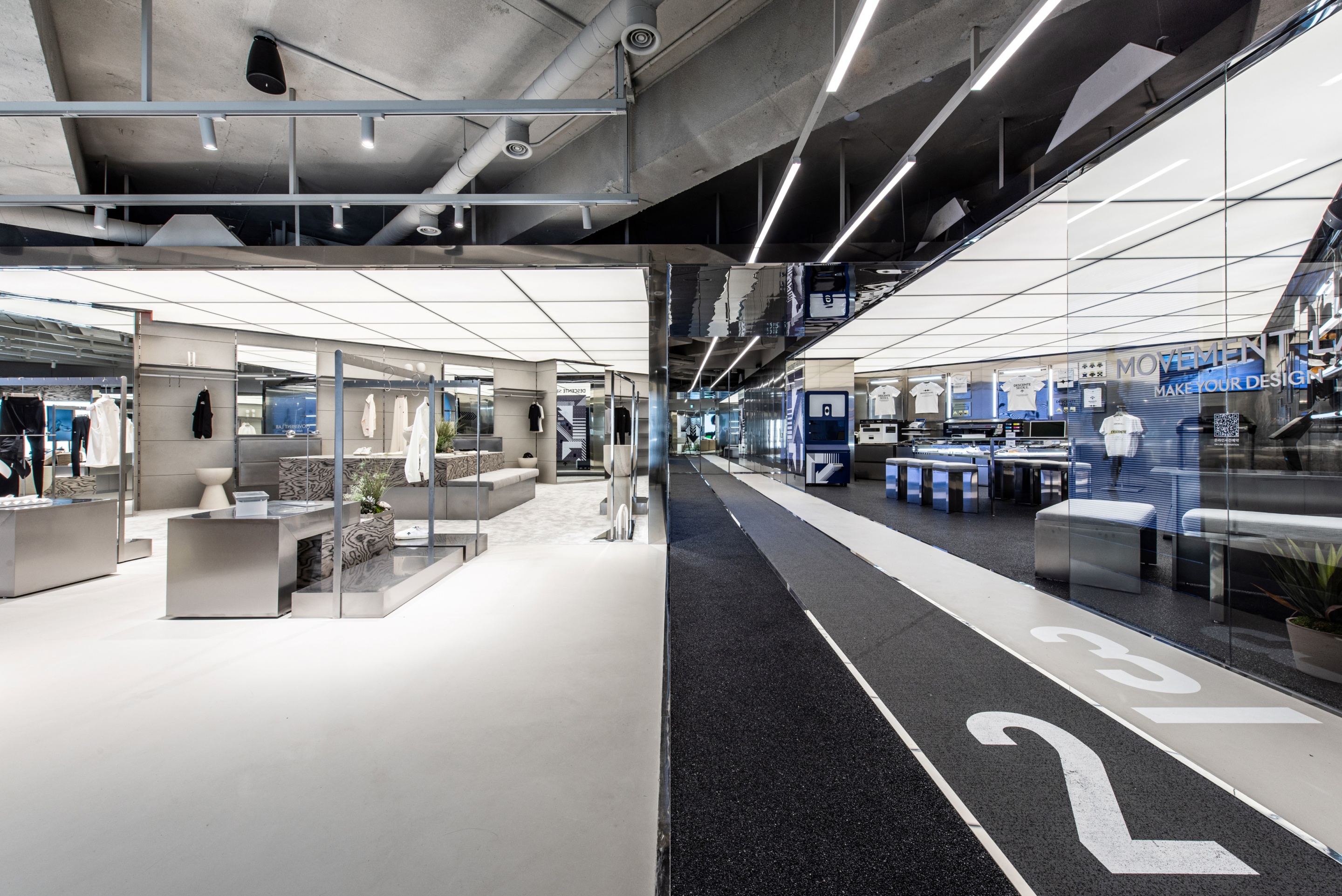 내부로 들어서면 브랜드의 역사와 기술력이 유기적으로 결합된 쇼케이스 공간이 펼쳐진다. 이 전시 영역은 브랜드의 시간성과 전문성을 효과적으로 전달한다. 2층에선 본격적인 제품 경험과 체험이 이루어진다. 모듈형 그리드 천장 시스템과 유연하게 이동 가능한 집기, 무광 처리된 금속 타일 등 반복적이면서도 밀도 높은 디테일이 하이테크와 장인 정신이라는 상반된 가치를 동시에 은유한다. 3층은 데상트가 새롭게 전개하는 여성복 라인을 소개하고, 랩lab 개념을 통해 브랜드의 미래 비전을 제시하는 공간이다. 러닝화 테스트를 위한 육상 트랙, 제품 제작 과정을 투명하게 드러내는 오픈형 연구소, 고객이 기술력을 체험할 수 있도록 세심하게 설계한 설치물 등이 특징이다. 한편 공간에 사용한 소재 또한 전략적 내러티브로 작용한다. 나무, 유리, 금속 등 시간의 흐름에 따라 물성의 변화를 느끼게 하는 재료들의 조합은 데상트가 오랜 세월 축적한 브랜드 헤리티지와 현재의 기술, 앞으로의 혁신적 진화를 표현한다. 니즈디자인랩은 서울의 상업적 중심지인 강남역에 위치한 이 플래그십 스토어를 통해 ‘장인 정신’을 물리적이고 구체적인 공간 경험으로 제안하고 있다.