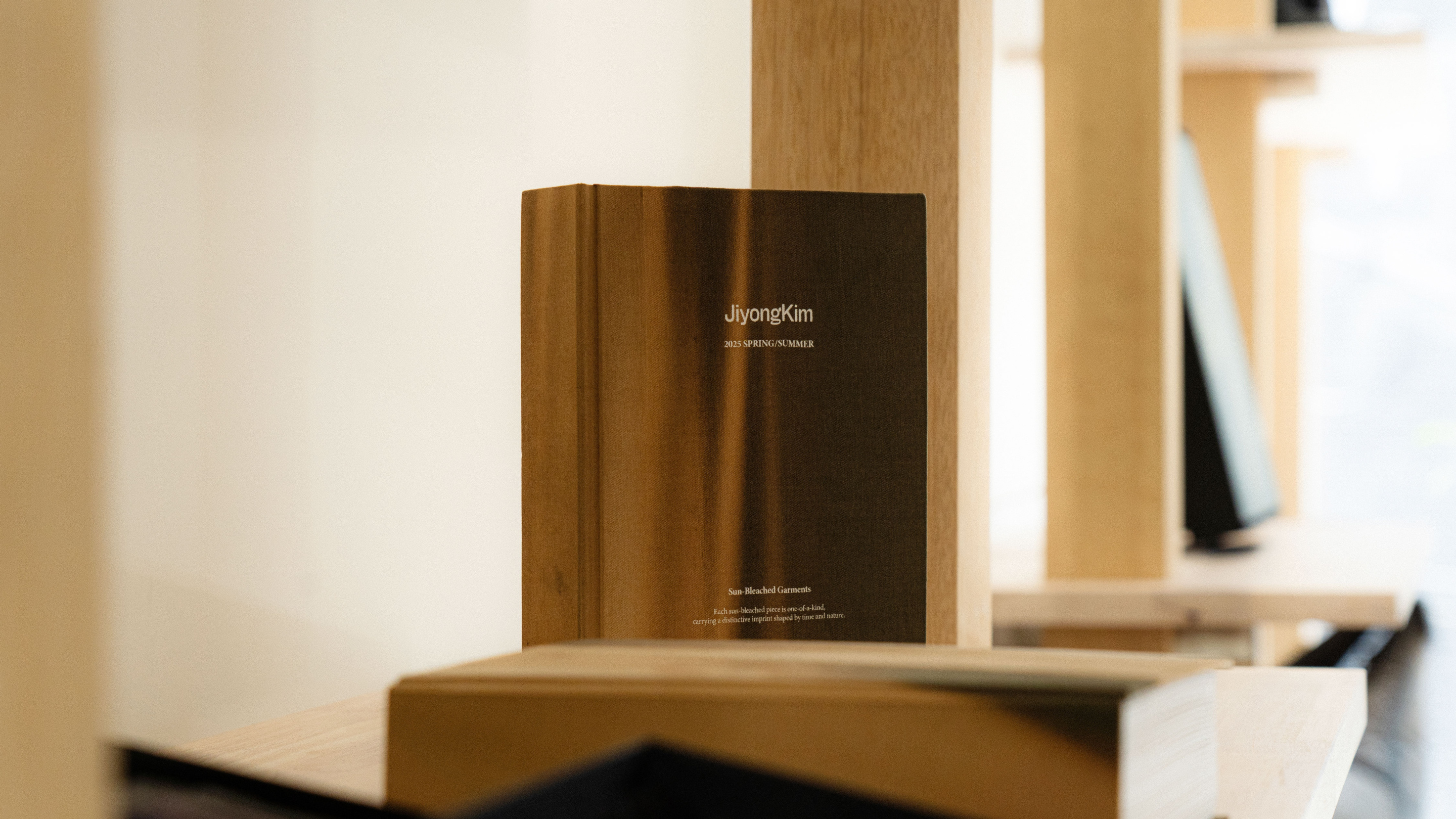 최근 한남동에 오픈한 지용킴의 플래그십 스토어에서는 옷을 단순히 진열해 놓지 않는다. 대신 직접 제작한 카탈로그를 통해 개체 하나하나의 차이를 소개하고, 고객이 이를 직접 입어보고 선택할 수 있도록 돕는 구조를 만들었다. 모든 선블리치 제품은 빛의 방향, 시간, 날씨에 따라 결과가 달라진다. 같은 패턴이라도 각기 다른 색감과 표정을 가진 옷들이 하나의 시리즈 안에 존재하는 셈이다. 이런 특성 때문에 매장에서는 각 개체의 실물 사진과 설명이 담긴 책자를 직접 만들어 운영하고 있다. 김지용 디렉터는 이 작업을 두고 “어떻게 이 모든 개체를 다 촬영하고 편집해서 책으로 만들겠어요. 정말 생산성이 떨어지는 방식이죠. 하지만 우리가 지켜야 할 가치가 바로 여기에 있어요”라고 말한다. 이는 지용킴이 추구하는 ‘개체성’과 ‘시간이 만든 옷’이라는 철학을 물리적으로 구현하는 방식이기도 하다. 산업 논리와 반하는 이 느린 카탈로그는, 오히려 브랜드의 정체성을 가장 명확하게 보여주는 하나의 장치로 기능한다.