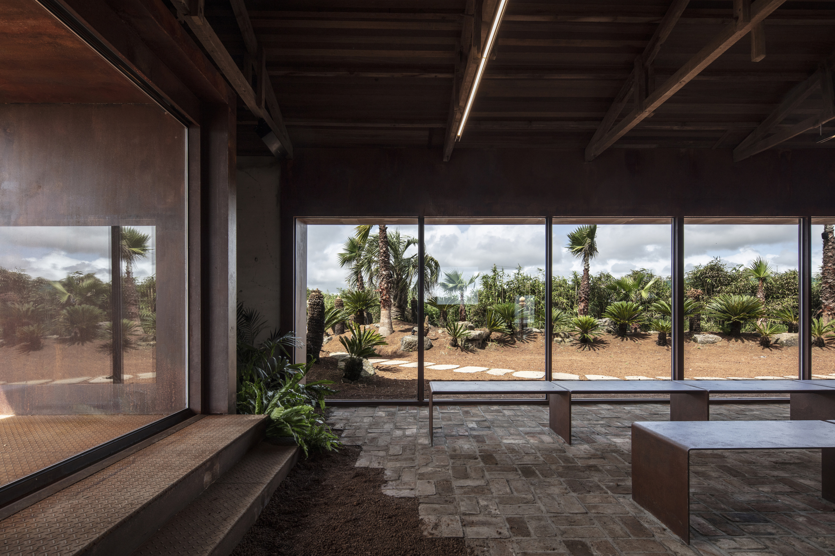 블루보틀 제주가 위치한 송당리는 돌담이 둘러싼 고요하고 한적한 마을로, 오름의 풍경을 감상할 수 있는 곳이다. 팀바이럴스는 제주도의 상징적인 요소인 ‘정낭’과 ‘퐁낭’에서 영감 받아 블루보틀 제주를 디자인했다. 공간 전체와 가구에 이러한 구조적 요소와 디테일이 적용되었으며, 친환경 건축자재와 제주 바다에서 수집한 폐공병을 가공 후 배합해 공간과 가구의 메인 소재로 활용했다.