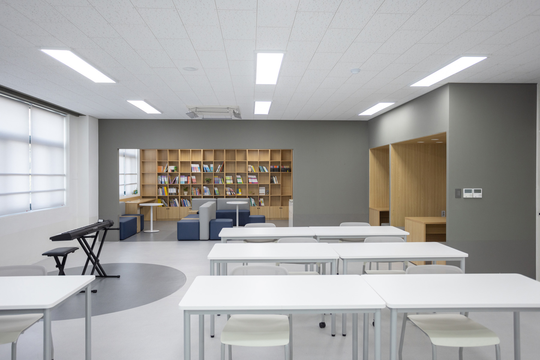 전체적으로 학생들이 공간에서 어수선함을 느끼지 않도록 안락한 분위기를 조성하는 우드와 회색 컬러를 사용했다. 각 실에 놓인 책상은 사용 목적에 따라 다양한 형태로 조합하여 사용할 수 있도록 모듈 형태를 선택했다.