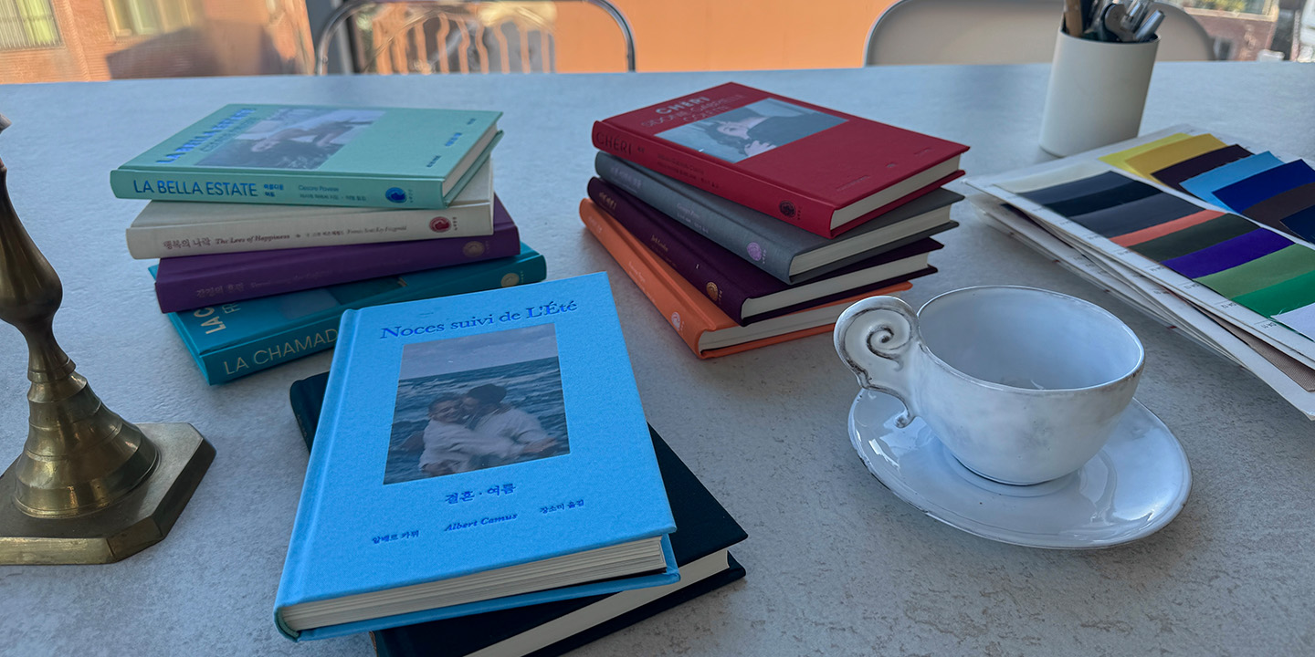 책 커버 디자인이 매우 인상적이에요. 여러 소재 중 패브릭 커버를 선택한 이유가 있을까요? 작품별로 컬러를 선정하는 방식이 궁금합니다.
