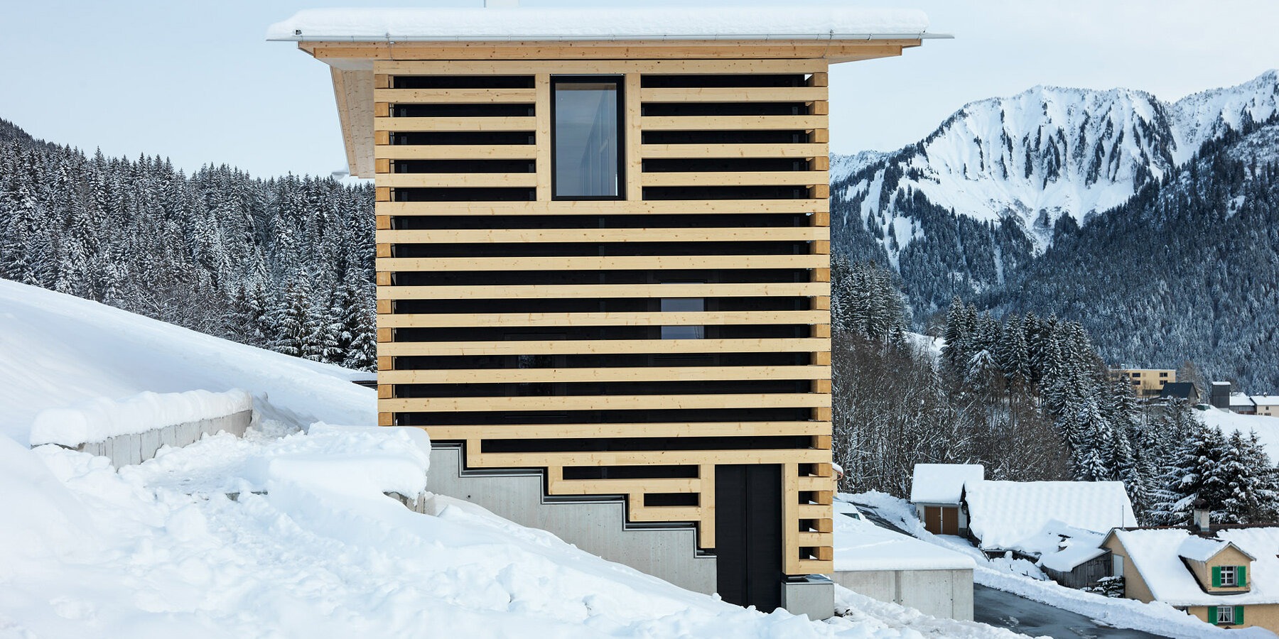 주택 외부는 수평 방향의 가느다란 목재 패널로 마감하고, 내부는 목재 벽체와 가구로 통일감을 줬다. 거실의 짙은 초록색 타일 벽과 주방의 대리석 조리대는 목재와 대조를 이루며 시각적인 포인트가 된다. 발코니는 주변의 아름다운 자연 풍경을 감상할 수 있는 주요 장소이며, 개방된 창을 통해 풍부한 자연광이 유입된다. 인나우어 마트 아키텍텐의 절제된 미학이 돋보이는 이 주택은 현대적인 감각과 전통적 외형을 균형 있게 결합해, 자연과의 조화로운 공존이라는 테마를 잘 구현한 사례로 평가된다.