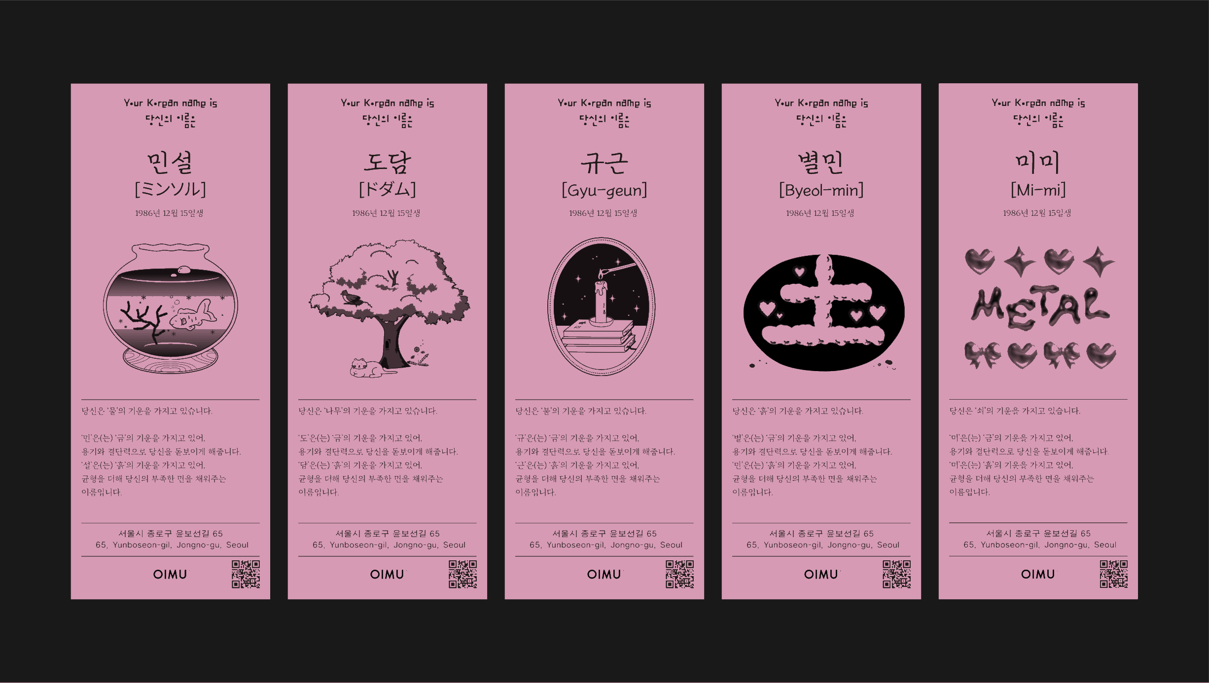 ‘사람의 인생은 이름을 따라간다’는 말이 있다. 숱한 미신이 세월의 풍화를 견디지 못하고 사라졌지만 사주팔자에 맞는 이름을 지어야 한다는 믿음만큼은 한국 사회에 여전히 뿌리깊게 남아 있다. ‘오이뮤 작명소’는 지극히 한국인다운 발상에서 출발했다. 작명을 함부로 해서는 안 된다는 생각에 외국인 친구에게 끝내 이름을 지어주지 못한 신소현 오이뮤 대표가 지난 과오를 만회하기 위해 일을 벌인 것이다. 한국을 찾은 외국인 관광객들이 각자 한국 이름을 하나씩 가지길 바라는 마음에서 ‘한 사람만을 위한 디지털 작명 기계’를 떠올렸다.