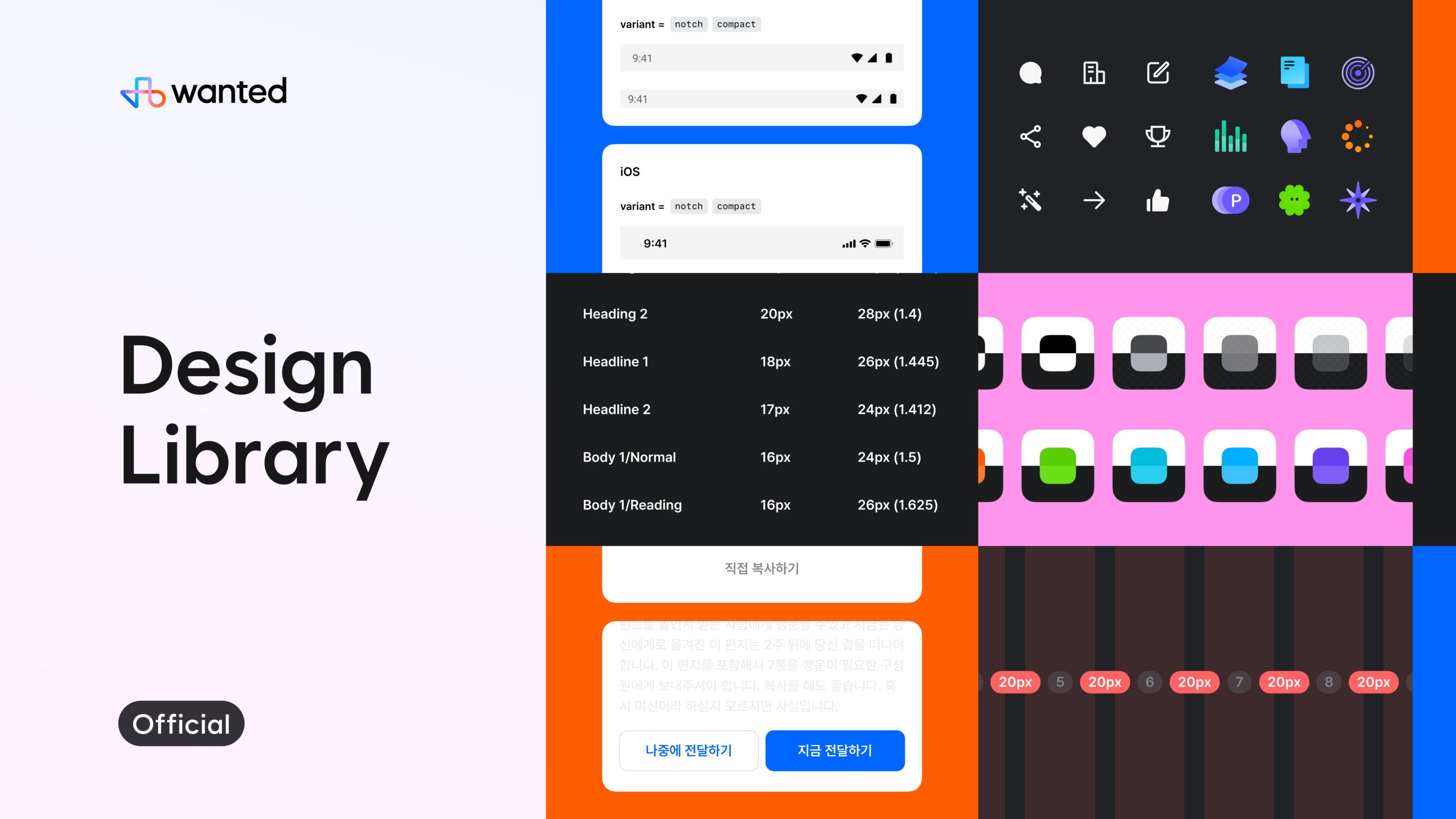 그리고 지난 4월 피그마 커뮤니티에 공개한 ‘원티드 디자인 라이브러리’에는 원티드의 노하우가 집약되어 있다. 범용성 높은 타이포그래피, 플랫폼 권장 명도를 준수하는 컬러 시스템, 라이트Light와 다크Dark 테마 지원, 체계적 구조로 반복 작업을 줄이는 컴포넌트 등 실무자가 유용하게 쓸 수 있는 다양한 자료가 담겨 있다.