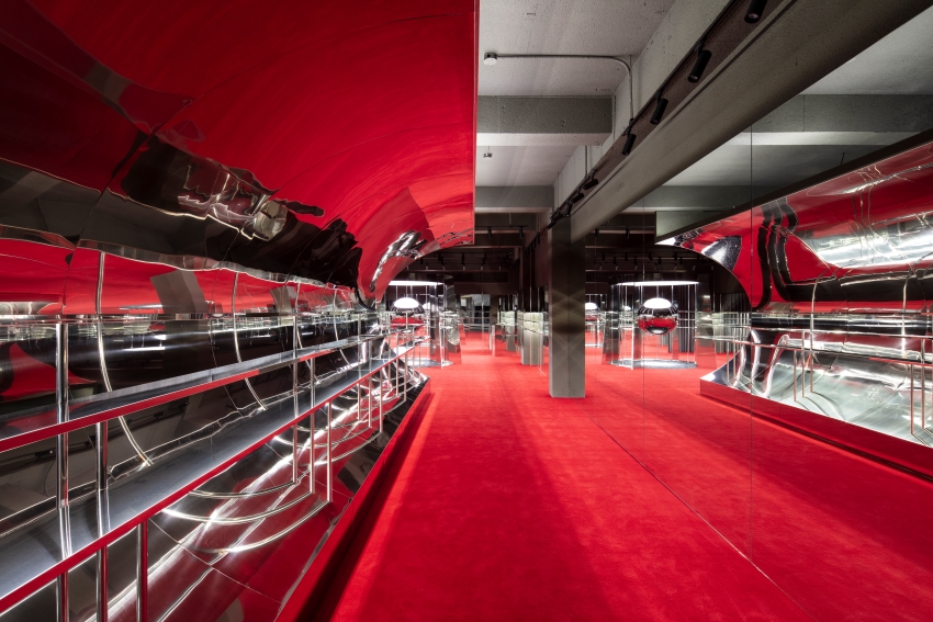 공간의 중심에는 메탈 소재의 구(球) 형태 오브제가 배치됐다. 이 오브제는 ROOM84의 핵심 개념을 드러내는 장치로, 반사되는 표면을 통해 공간과 빛, 방문자의 움직임을 그대로 담아낸다. 구체는 공간의 기준점으로 작동하며, 동선과 시선이 이 오브제를 중심으로 회전하고 확장되도록 구성됐다. 이를 통해 브랜드가 설정한 시선의 방식과 세계 인식이 공간 구조 전반에 반영된다.