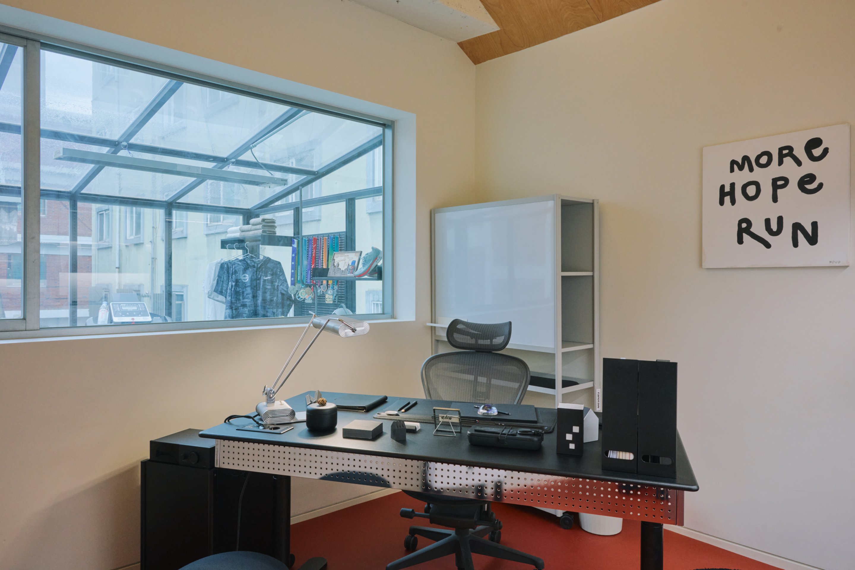 이 오피스의 부제가 Run, Drink, Read예요. 어릴 때는 하나에 지독하게 몰입하는 게 좋았는데, 지금은 여러 활동 사이의 균형, 어느 하나 소홀하지 않는 게 필요하다고 생각해요. 저 세 단어 안에 인풋과 아웃풋, 소비와 생산, 지적이고 감각적인 유희와 몸을 단련하는 즐거움, 방탕한 소진과 수련을 통한 구도가 균형 있게 들어가 있고, 그것이 공간으로도 표현되었어요.