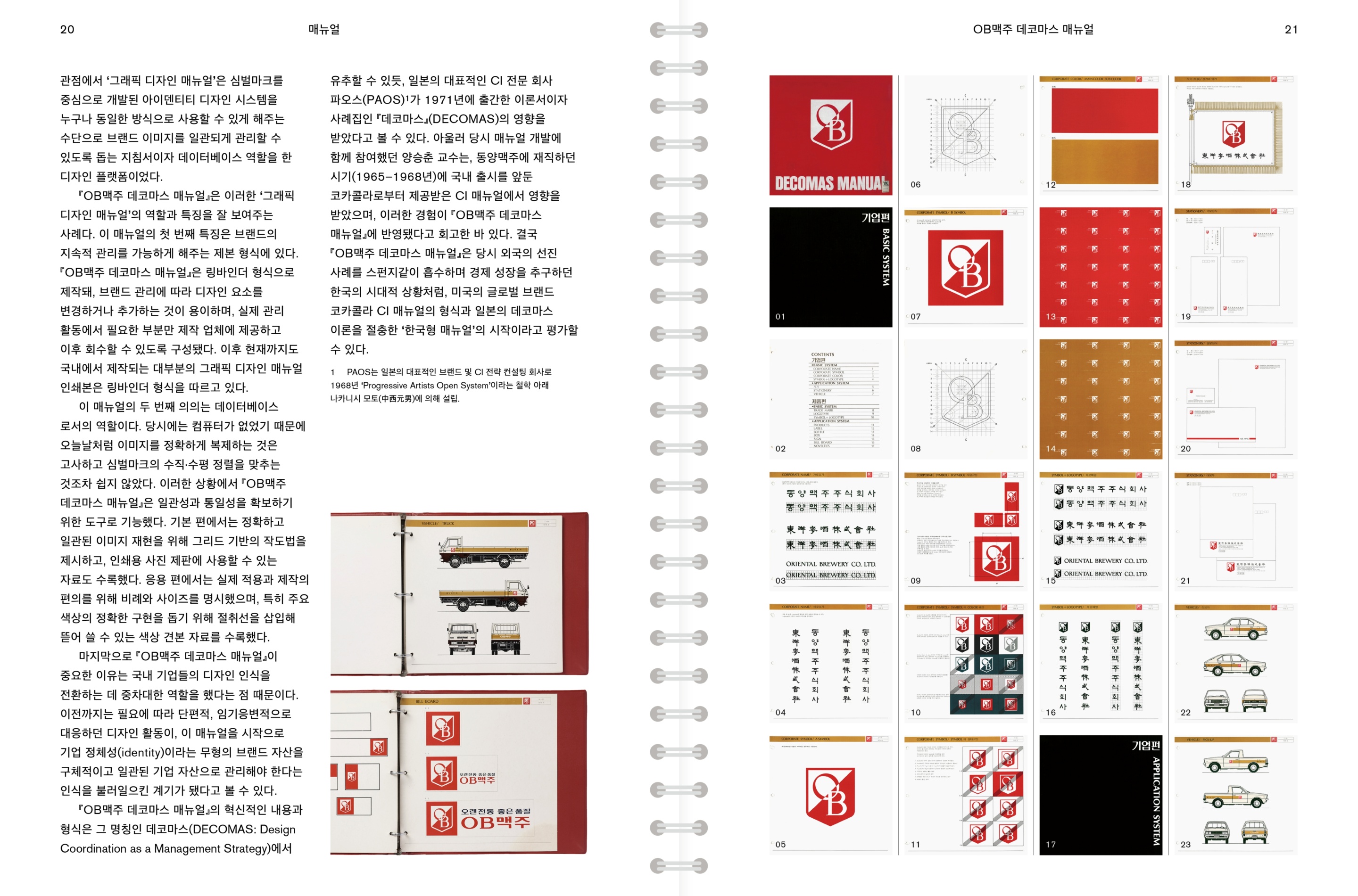 지난 1월 프로파간다에서 출간한 〈코퍼레이트 아이덴티티 매뉴얼 1970~1990년대〉는 1970년대부터 1990년대까지 제작된 국내 기업의 아이덴티티 디자인 매뉴얼을 종합한 책이다. 1970년대 고도 성장기가 시작되면서 기업 경영의 합리화·현대화가 요구되었고, 수출 주도 성장 전략이 본격화됨에 따라 많은 기업이 해외 진출을 위해 자사의 아이덴티티를 정비하기 시작했다. 〈코퍼레이트 아이덴티티 매뉴얼 1970~1990년대〉가 1970년대부터 1990년대까지를 주목한 이유다. OB맥주, 신세계백화점, 쌍용그룹, 대전엑스포 등 총 17개의 매뉴얼에 대한 깊이 있는 해설과, 매뉴얼을 제작하던 당시 활약한 디자이너들의 인터뷰를 실었다. 또한 아이덴티티 디자인의 핵심인 기업 전용 서체도 함께 수록했다.