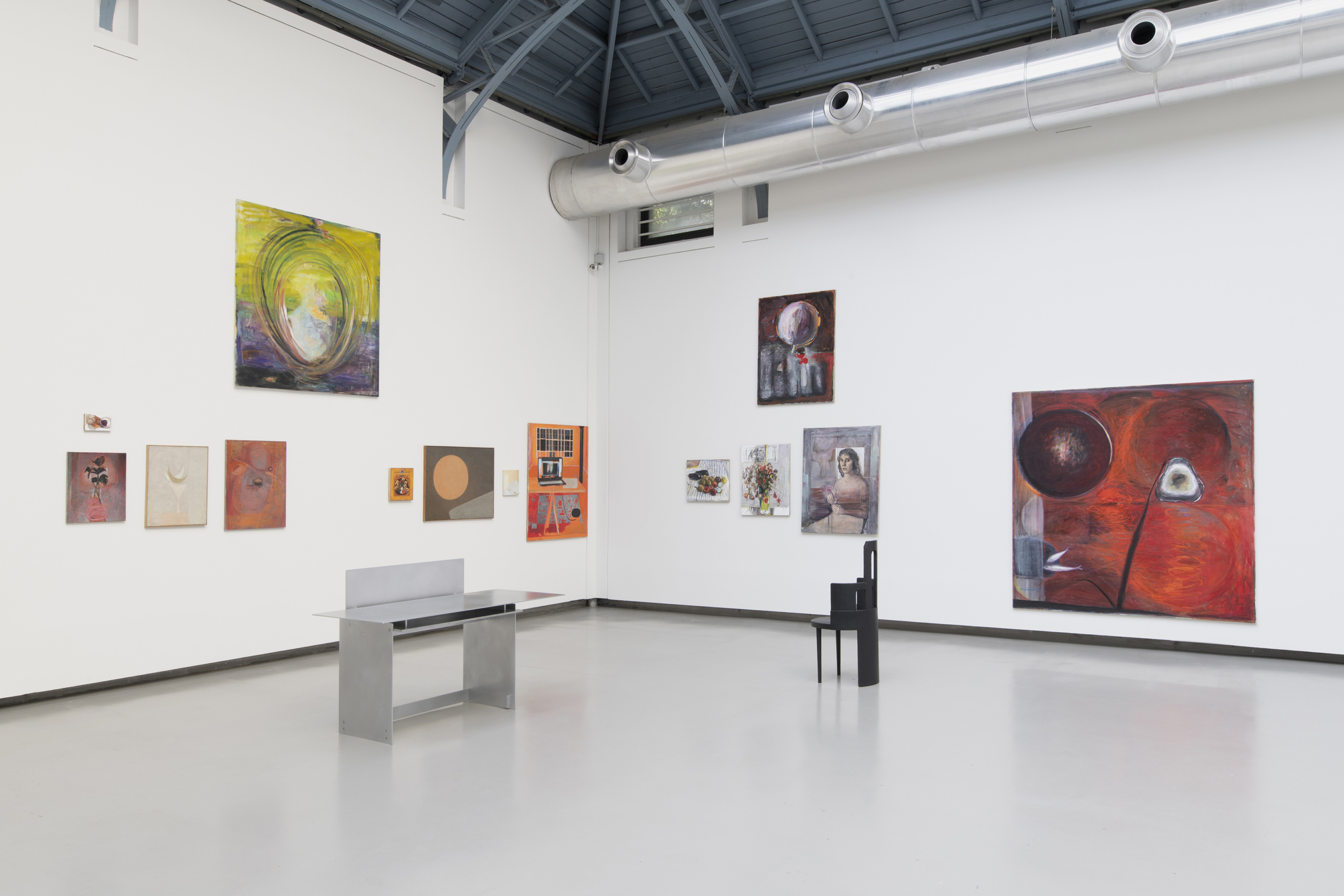 전시는 엘렌 샤트베라슈빌리의 회화 약 20여 점을 중심으로 다섯 명의 회화 작가 – 장 클라라크Jean Claracq, 나타나엘 에르블랭(Nathanaëlle Herbelin), 마틸다 마르크 부아레(Mathilda Marque Bouaret), 미란다 웹스터(Miranda Webster), 그리고 선배 세대의 화가 베라 파가바(Vera Pagava) – 의 작품이 함께 놓였다. 여기에 조지아 기반의 룸 스튜디오Rooms Studio와 요한 빌라드리히(Johan Viladrich)의 가구, 그리고 신학자 필리프 프랑수아(Philippe François)의 텍스트가 더해졌다. 이 구성은 그룹전으로 명명하기 보다, 하나의 테이블에 둘러앉은 장면을 연출한다고 설명하고 싶다. 큐레이터는 이를 환대의 공간이라 말하는데, 작품들이 서로를 압도하지 않으면서 시선을 나누며 공존하기 때문일 것이다. 이 전시는 각각의 작업을 고립시키기보다 동시대적 친연성 속에서 함께 읽히도록 유도한다.