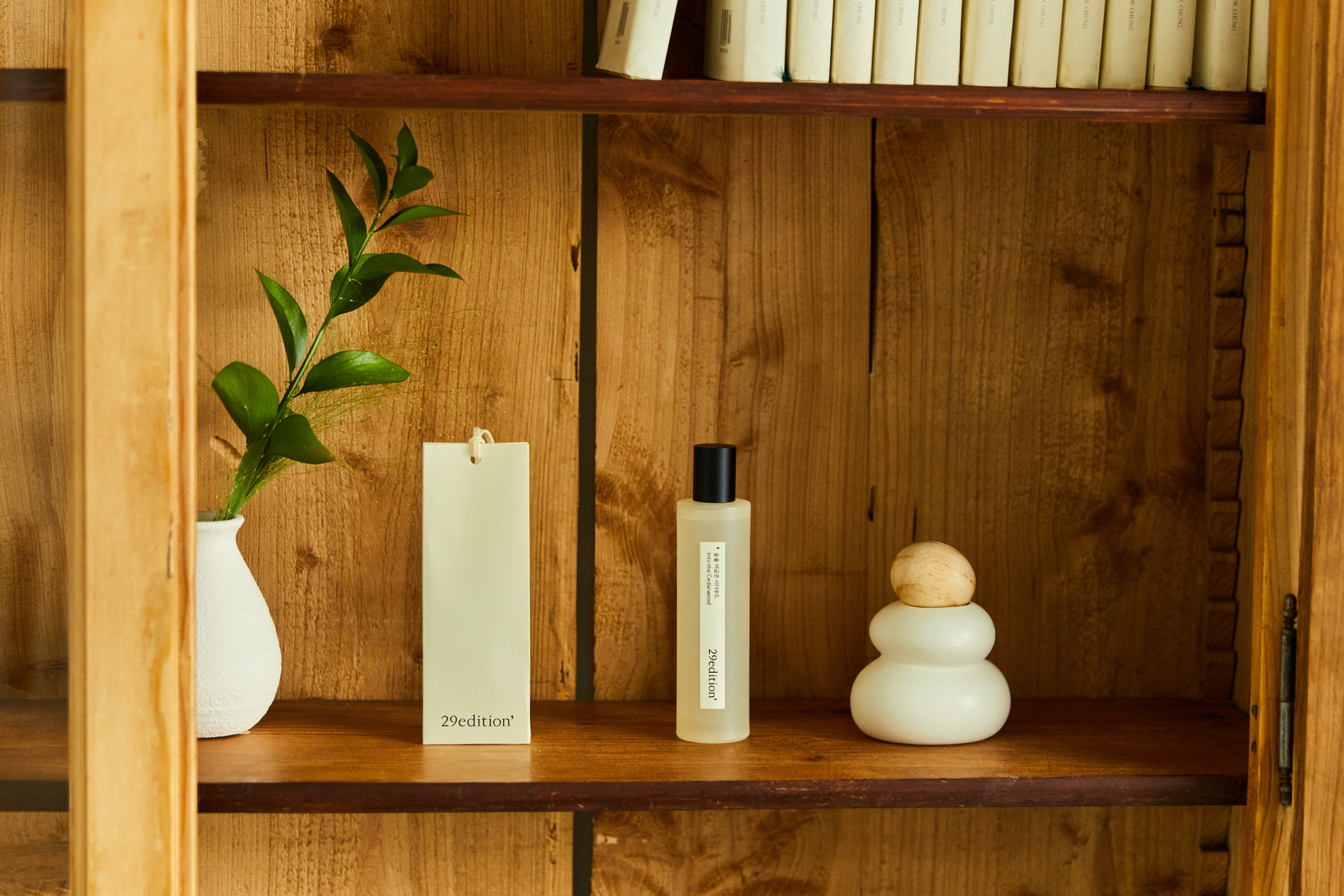김영롱 이번 프래그런스는 ‘숲을 머금은 시더우드’ ‘피어난 그린로즈’ ‘베르가못의 안녕’ 총 세 가지 향으로 출시되었어요. ‘디퓨저’ ‘룸 스프레이’ ‘사쉐’ 세 가지 형태로 취향 따라 원하는 방식으로 공간에서 향을 즐길 수 있도록 했고요. 재미있는 비하인드 스토리는 이 중 ‘숲을 머금은 시더우드’가 사실 2년 전 이구성수를 오픈하면서 공간 팀에서 퍼스널 바디케어 브랜드 ‘알보우(Rbow)’와 협업해 자체적으로 개발한 29CM 시그니처 향이었다는 건데요. 판매용이 아닌 29CM 공간만을 위해 제작한 비매품이었는데도 종종 매장에 방문하는 고객분들이 어떤 향이냐고 자주 물어올 정도로 인기가 많았거든요. 그러다 저희가 이번 프래그런스 라인을 준비하는 과정에서 이 향은 꼭 라인업에 넣어야겠다고 생각했고요. 그 외에 이번에 새롭게 제작한 향은 ‘피어난 그린로즈’ ‘베르가못의 안녕’ 이 두 가지로, 외부 조향 업체와 협업해 완성했어요. 최종 후보로 다섯 가지 향이 있었는데 내부 투표를 통해 두 가지 향으로 좁혀질 수 있었고요.