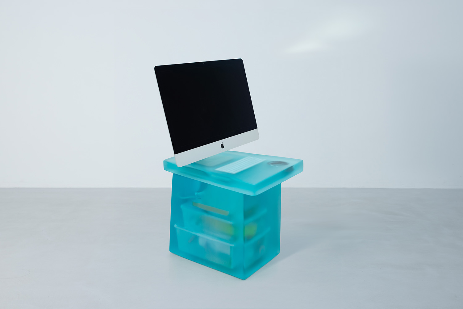 특히 ‘Dip series – My Studio’는 이러한 접근이 가장 직접적으로 드러나는 시리즈다. 디자이너의 실제 작업실에서 사용되던 물건들이 레진과 결합하며 새로운 오브제로 전환된다. 오래된 컴퓨터는 의자의 등받이로 기능하고, 책상 아래에 놓여 있던 수납함과 케이블, 책, 플러그는 뒤엉킨 상태 그대로 굳어 하나의 구조를 이룬다. 거울은 더 이상 반사 도구가 아닌 벽면의 조형물이 되고, 카트의 바퀴는 로우 테이블을 지지하는 요소로 재배치된다. 각각의 사물은 새로운 기능을 가지게 되지만, 이전에 가지고 있던 흔적을 완전히 잃지 않는다.