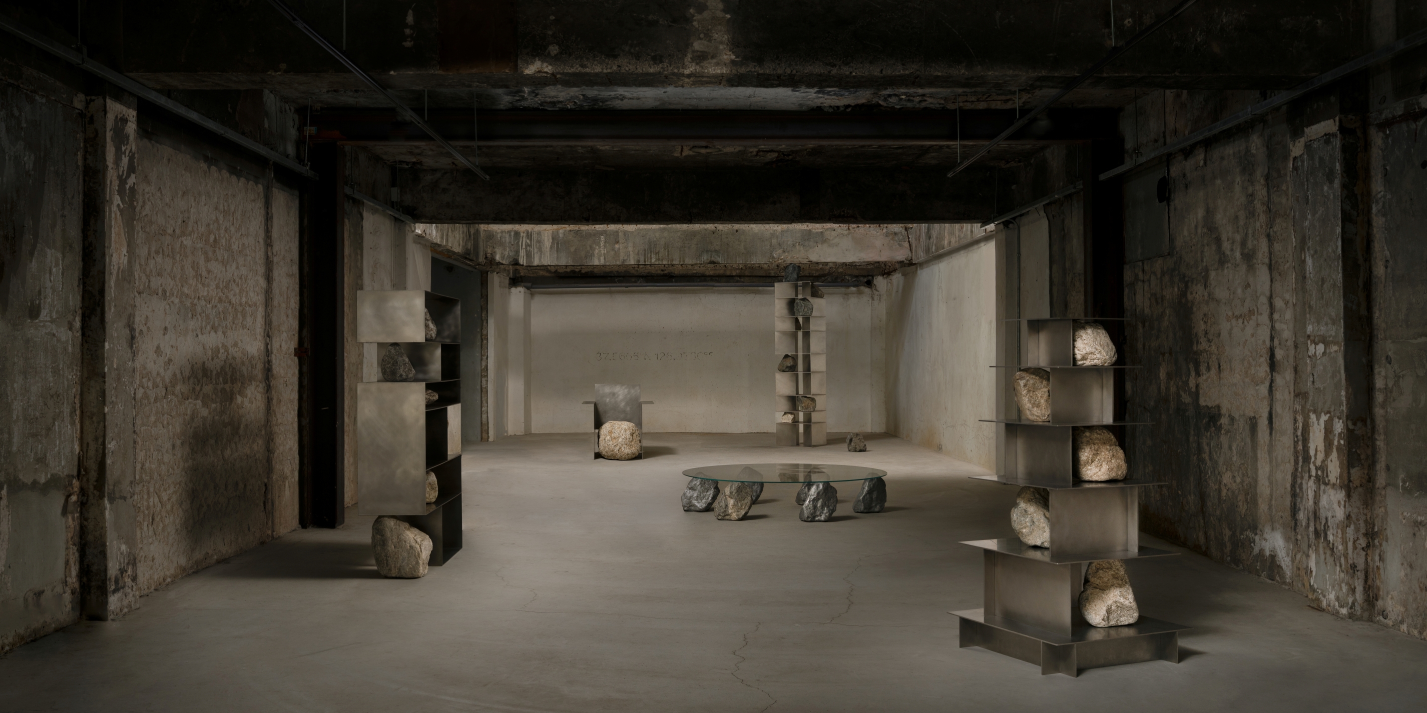 지하에서는 이시산이 돌과 금속 등 무겁고 구축적인 재료를 선보이며 공간의 중력감을 끌어올린다. 자연과 도시에서 수집한 재료의 본질을 형태로 드러내는 작업이다.