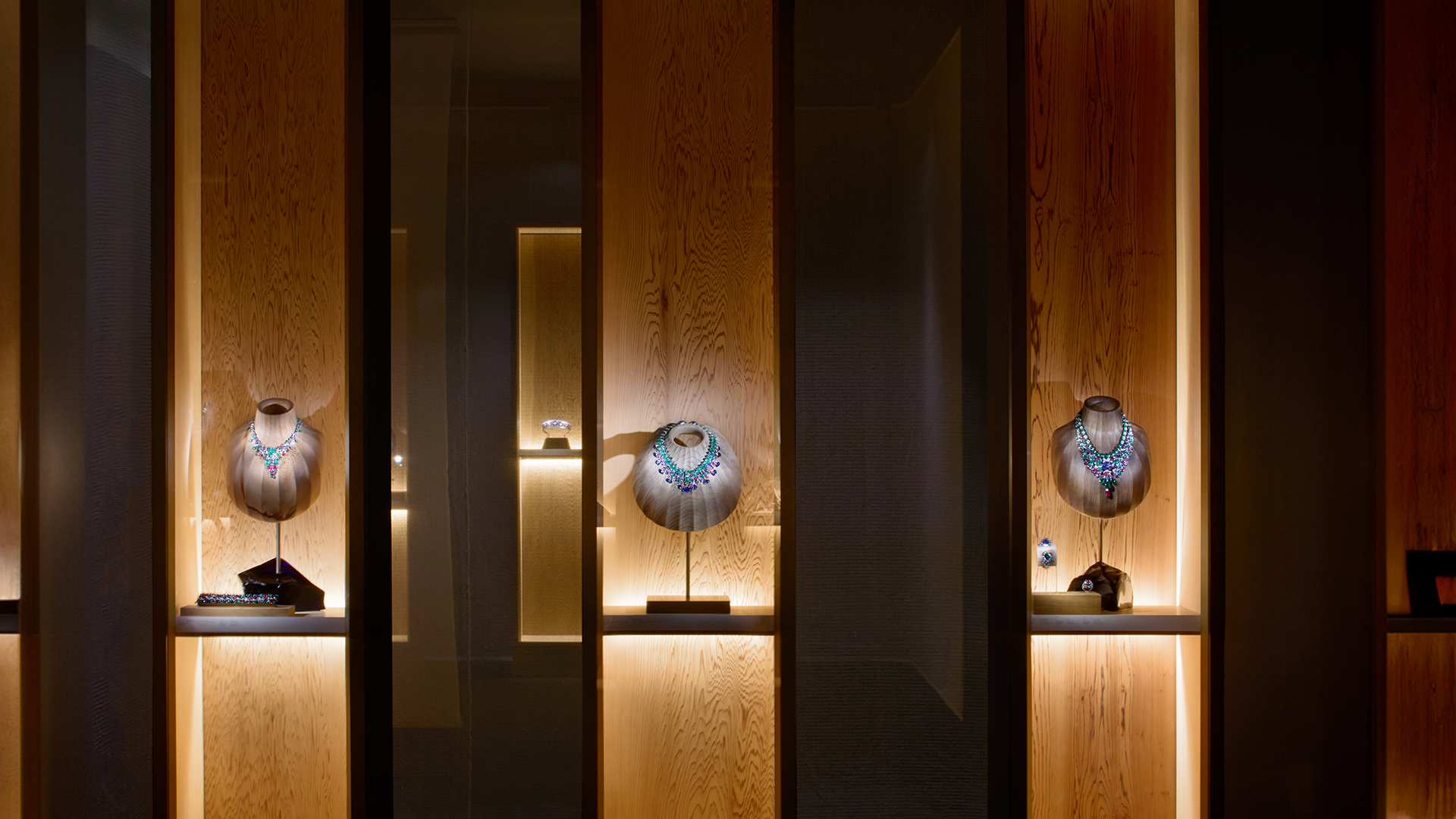 까르띠에 전시의 특징 중 하나는 각 나라의 문화적 배경이 전시에 녹아든다는 점이다. 이번 전시를 위해 온지음이 함께했다. 온지음은 한복, 한식, 한옥 공방을 두고 우리 의식주 문화의 체계적인 아카이빙과 장인 양성을 위한 교육과 연구를 하는 곳. 온지음이 까르띠에의 후원을 받아 복원한 직물 ‘라’가 전시장 곳곳에 활용되었다. 조금은 생소하게 느껴지는 ‘라’는 삼국시대부터 쓰이기 시작해 조선시대부터 점차 사라진 우리 전통 직물이다. 서양의 니트 조직과 비슷한 모양에 투공 효과를 내는 반투명한 직물로, 전시장에서 공간을 구분하며 은은한 분위기를 연출하는 가림막 역할을 했다. 프롤로그 공간에서 동굴의 빛기둥을 연출하는 데 활용된 것도 라 직물. 또한 온지음이 전시에 맞춰 제안한 고가구가 까르띠에 주얼리와 함께 전시된 모습도 볼 수 있다. 유럽의 문화에 뿌리를 둔 까르띠에의 섬세한 주얼리가 우리 고가구와 함께 어떻게 어우러지는지 주목해보자.