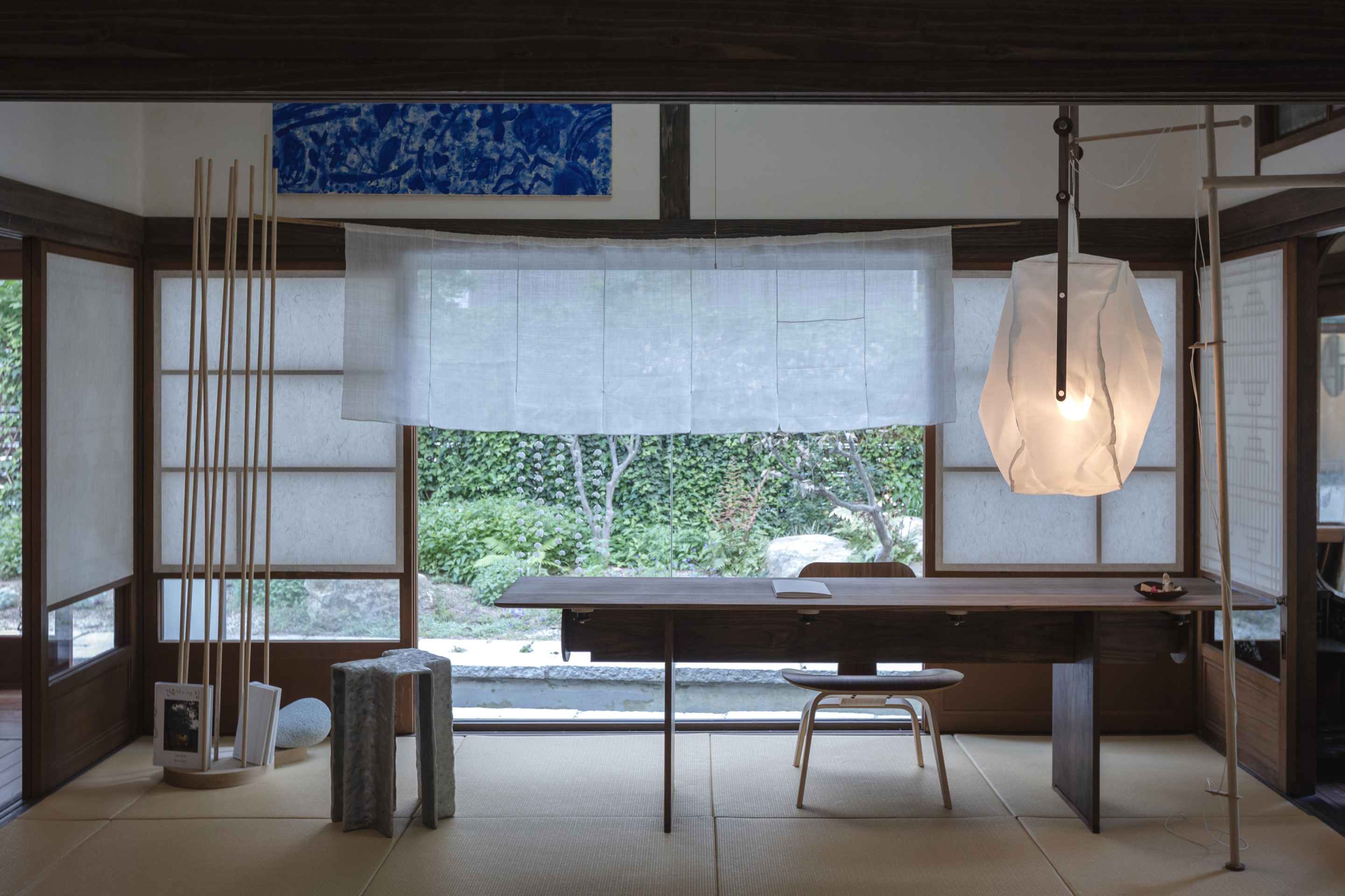 일본식 가옥인 오초량 1층과 2층 공간에는 유독 눈길을 끄는 공간이 하나 있다. 바로 도코노마다. 다다미 바닥 보다 한 단 높여 만든 도코노마는 화병, 서예 족자, 미술품 등 값비싼 장식품을 올려두는 장식 공간이다. 이번 전시에서도 하이라이트 역할을 톡톡히 한다. 1층 도코노마에는 포스트 단색화가로 불리는 남춘모 작가의 회화 작품 두 점과 이혜미 작가의 도자 작업, 황형신 작가의 테이블 작업 각각 짝을 이루고 있다. 흥미로운 건 도코노마 위에 올려진 작품들이 각기 다른 장르와 소재를 지니고 있음에도 어느 하나 모난 것 없이 균형의 미를 갖췄다는 점이다.