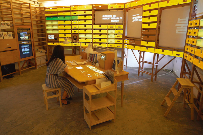 경기도의 문화, 인물, 유산, 사건 등 시대와 키워드별로 정리된 아카이브를 열람할 수 있는 ‘경기도 메모리, 기억의 도서관’(2018). 이야기 카드를 매개로 사용자와의 인터랙션을 통해 서가와 책상 위로 디지털 정보가 펼쳐진다. 책상 위 스탠드 조명에도 OCR 카메라 센서가 달려 있어 손 동작을 인식해 정보를 열람하도록 돕는다.