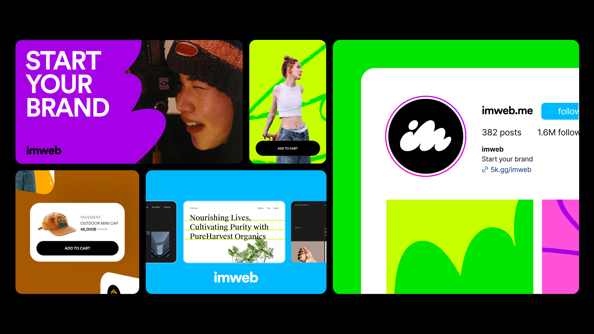 이미 반응형 웹사이트를 구현하면서 많은 편리함을 제공하게 되었지만, 현재에 머무르지 않고 꾸준한 시도를 보여왔어요. 지난해 아임웹의 정체성을 ‘웹 빌더’에서 ‘브랜드 빌더’로 확장했죠. 그러한 미션에 발맞춰 새롭게 제공하는 서비스에는 어떤 것들이 있나요?