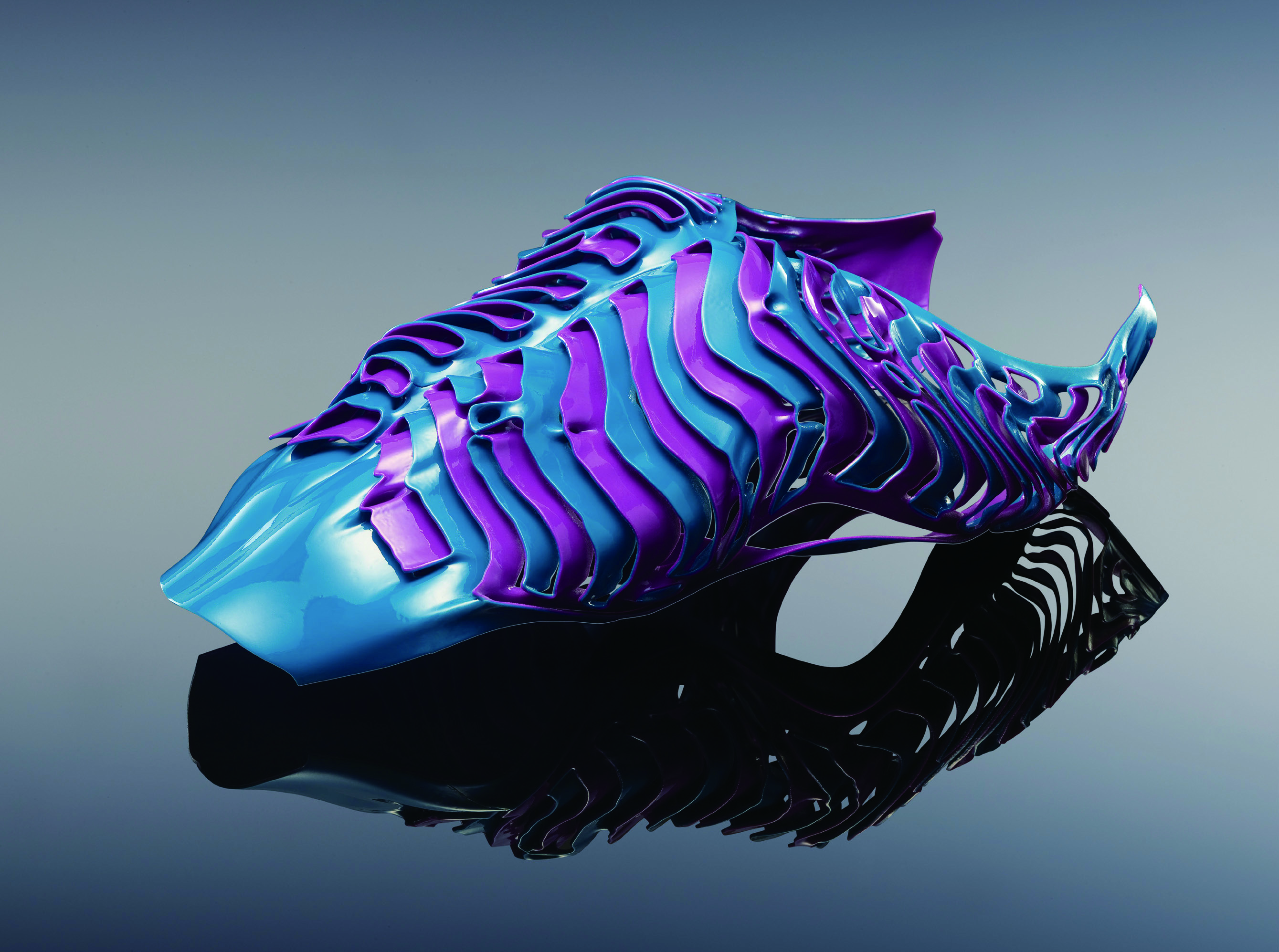 인간의 몸에 소의 머리가 달린 미노타우르스는 그리스 신화에 나오는 유명한 괴물이다. ‘봉합선이 있는 미노타우르스 머리(Minotaur Head with Sutures)’는 충격 흡수식 보호 헬멧이다. 뿔 형태와 사람 두개골에 있는 봉합부에서 착안한 이 착용형 두개골은, 유연성 있는 봉합선을 삽입해 한 번에 출력했다. 실제 인간의 두개골 결합 공정과 비슷하게 이 헬멧은 봉합선의 두께와 밀도, 곡률을 다양하게 적용해 영역별로 유연한 정도가 다르게 만들었다. 공간을 채우는 프랙탈을 본떠 만든 이 봉합선들은 헬멧 표면에 부피감을 선사해 더 안전하고 편안한 경험을 선사한다.