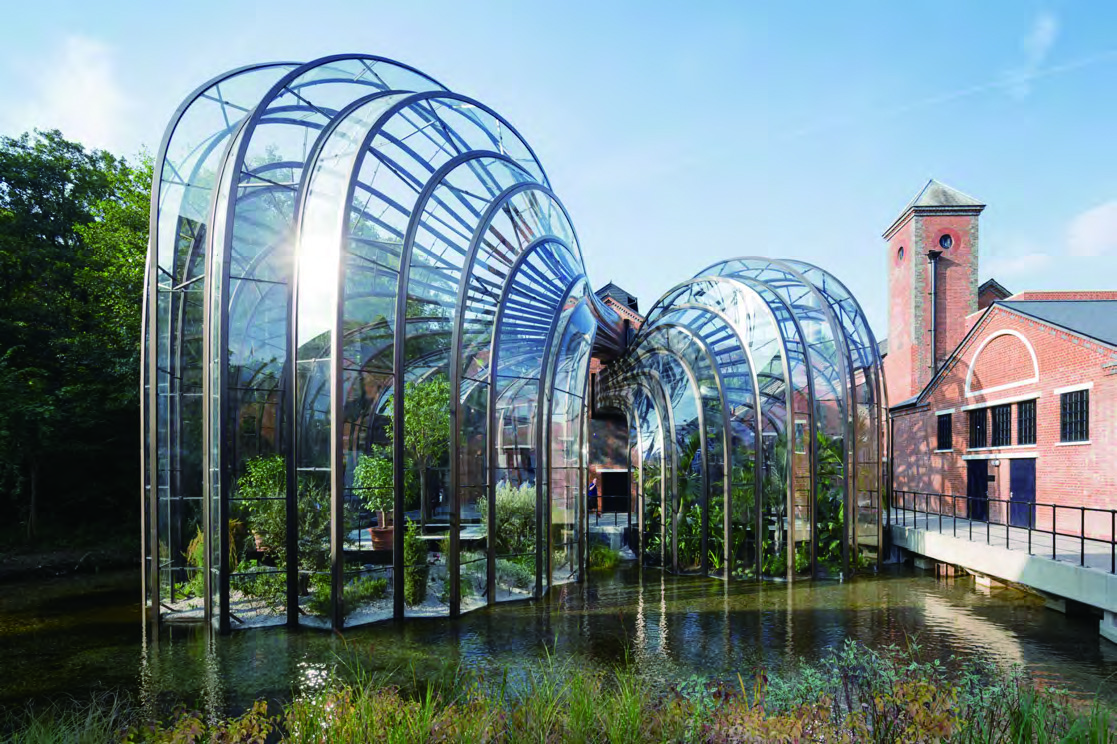 봄베이 사파이어의 첫 전용 증류소와 방문자 센터. 증류소에서 뻗어 나오는 듯한 형태의 온실에서는 잔열을 활용해 진(gin)을 제조하는 데 필요한 10종의 식물이 자란다. ©Iwan Baan