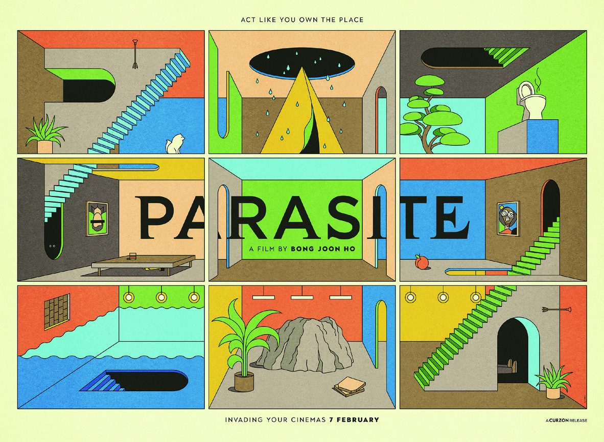 영화 〈기생충〉의 영국 개봉에 맞춰 포스터 작업을 한 디자인 스튜디오 라 보카La Boca의 스콧 벤달Scot Bendall이 밝힌 디자인 스토리다. 아카데미가 열리기 며칠 전 주고받은 이메일에서 그는 〈기생충〉을 세 번 봤고, 그 횟수는 계속 더해질 것이라고 했다. 아카데미 시상식이 끝난 지금, 라 보카가 또 다른 버전의 포스터를 발표한다면 이젠 그 속에 3개의 오스카 트로피를 더 숨겨야 할 것이다. 2020년 아카데미에서 〈기생충〉이 수상한 부문은 작품상, 감독상, 각본상, 국제장편영화상에 이르기까지 모두 4개에 달하니까 말이다.