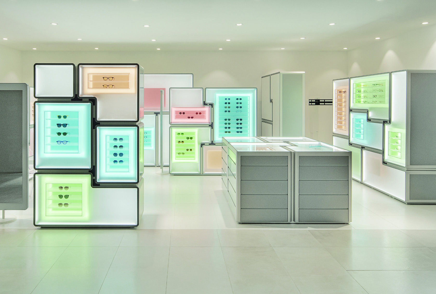 백화점이나 복합 쇼핑몰이 오픈한 이후 결국 사람들의 발길을 끄는 건 그 안에 어떤 매장과 시설이 있느냐에 달렸다. 지난 3월 오픈한 갤러리아 광교 역시 마찬가지. 유명 건축가 OMA가 디자인했다는 화제를 뒤로하고, 이제 사람들은 내부를 들여다보기 시작했다. 아이웨어 브랜드 파피루스 편집숍은 눈에 띄는 곳 중 하나다. 부드러운 파스텔컬러를 활용한 모듈형 내부는 세계문화유산인 수원화성의 전통 돌 쌓기 방식을 모티브로 했다. 벽과 문이 없어 개방적이면서도 동선이 유연하며 검안부터 조립, 수납 등 공간의 다양한 역할을 효율적으로 담아냈다. 모듈 구조의 3t 알루미늄은 사출 금형 방식으로 제작하고, 그 사이를 불투명 처리한 20t 아크릴로 마감했다.