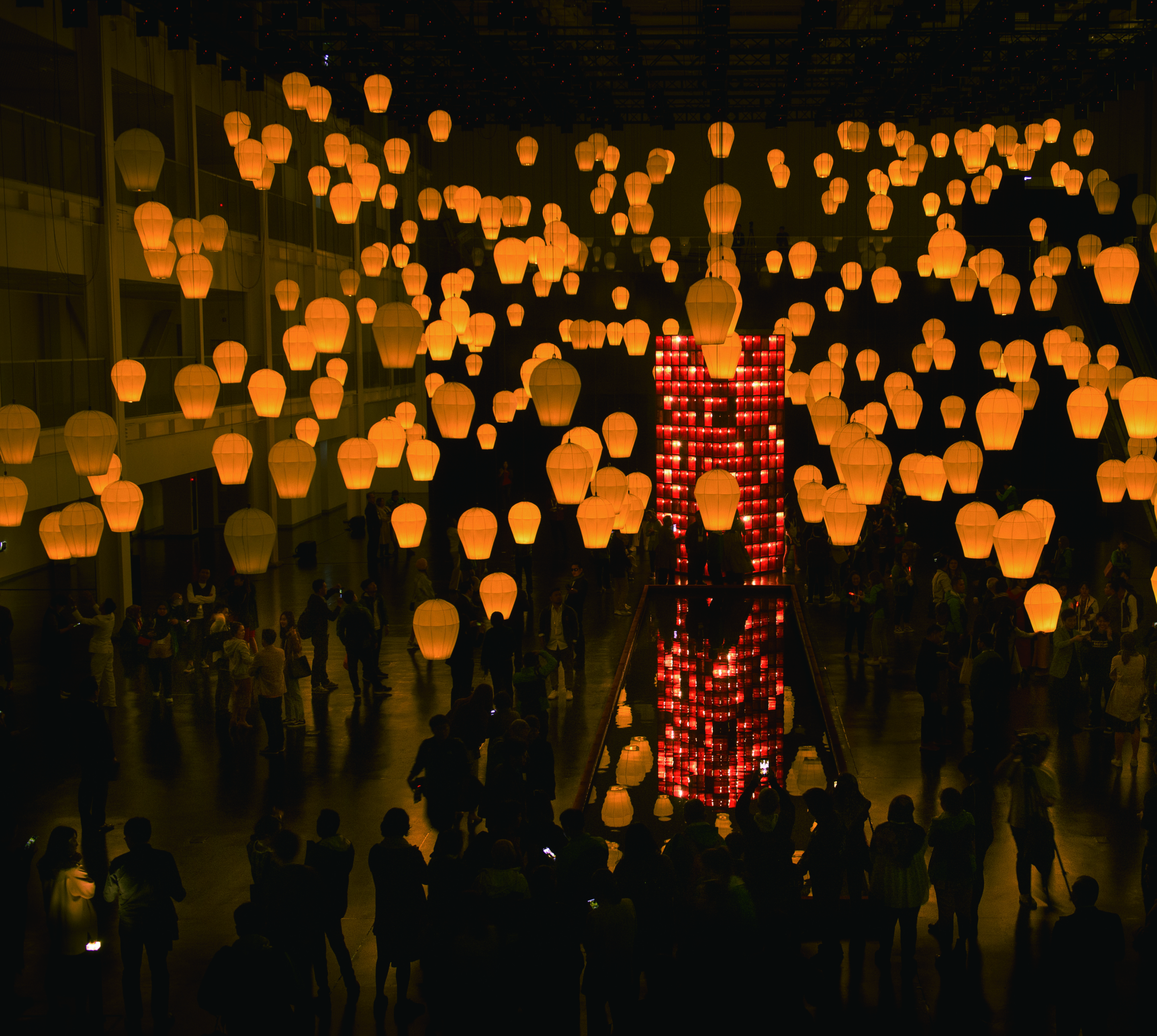 ‘풍화’는 수백 개의 풍등이 공중에서 위아래로 움직이는 키네틱 작품이다. 아시아 문화권의 등불 축제를 모티브로 했다. 보통 강이나 호수, 바다 같은 수변 지역에서 열린다는 점에서 물과 거울을 함께 설치해 공간을 조성했다. 풍등의 시초는 삼국시대 제갈공명이 전시에 위험한 상황을 알리기 위해 고안한 것이었다. 이후 소통의 수단이자 염원을 담은 놀이로 중요한 문화가 됐다. 사일로랩의 ‘풍화’는 관객과 소통하고자 하는 의미를 담고 있다.