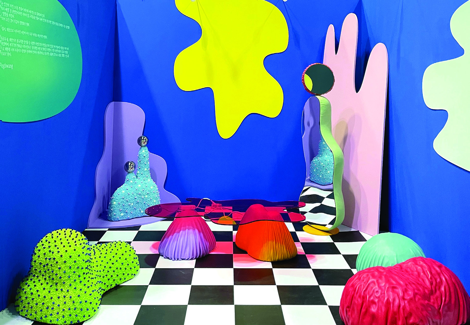 제한된 부스 안에서 전시해야 하니 선택과 집중이 필요했다. 평소 심해 생물에서 영감을 많이 얻는 편이라 아예 바다를 주제로 공간을 연출해보면 어떨까 생각했다. 무엇보다 관람객에게 미지의 영역에 진입하는 듯한 경험을 주고 싶었다. 유선형 오브제, 격자무늬 바닥 등을 차용한 이유다. 격자무늬는 다소 식상한 접근일 수 있지만 그만큼 직관적이라고 생각해 선택했다. 〈이상한 나라의 앨리스〉에 나오는 격자무늬를 떠올려보라.