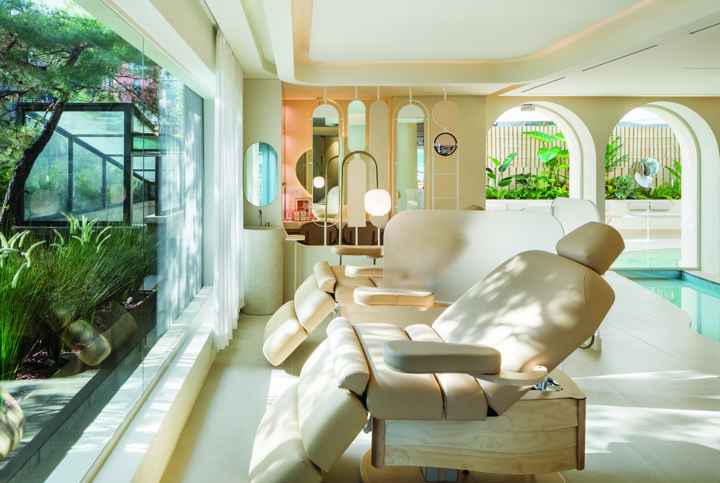 건물 1층에 위치한 매장의 콘셉트는 분명하다. ‘워터풀 데저트Waterful Desert’라는 매장 이름에 걸맞게 사막 한가운데서 마주하는 힐링 섬이 디자인의 주제다. 고객은 사막, 물, 동굴, 숲을 모티프로 한 공간을 차례로 지나며 지친 일상으로부터 점차 해방된다. 매장 입구에서부터 스킨 톤 파사드와 색 모래, 다양한 식물은 이국적인 곳으로 여행 온 것만 같은 기분을 선사한다. 아치형 입구를 통해 매장에 들어서면 마치 태양을 마주한 듯 강렬히 빛나는 리셉션이 고객을 맞이한다.
