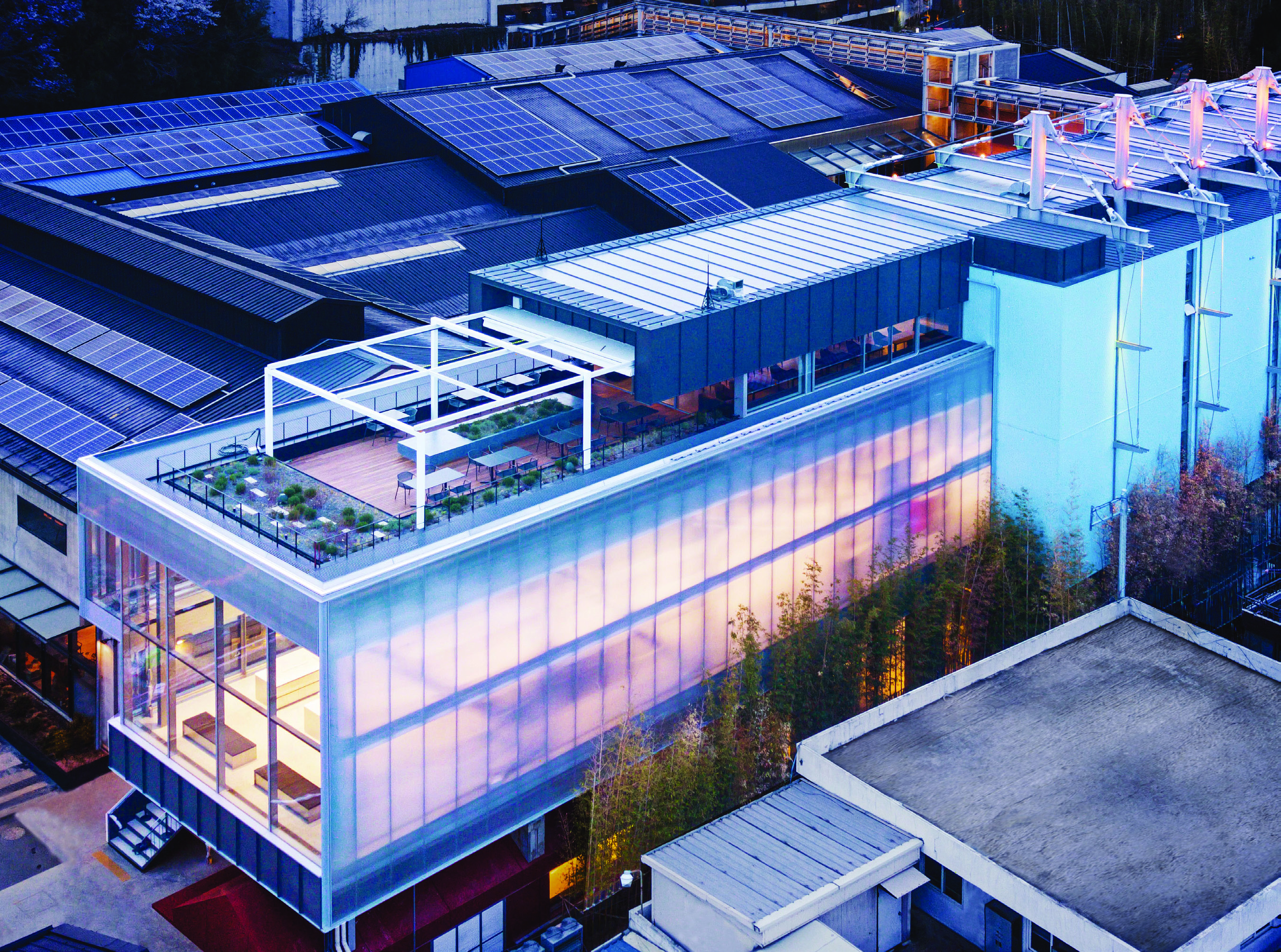 현대 모터스튜디오 부산이 위치한 건축물은 원오원아키텍츠 최욱 소장의 설계로 완성됐다. 부둣가의 크레인과 컨테이너를 디자인 모티브로 삼아 와이어와 철골을 핵심 소재로 활용한 것이 특징이다. 폭 12m, 길이 90m의 독특한 공간 비례는 바다 위에 떠 있는 현수교를 떠올리게 한다. 또 기둥 대신 고려제강 와이어의 장력으로 건물을 지탱하도록 설계해 야외 공간을 여유 있게 확보한 점도 인상적이다. 이곳에는 부산 시민과 소통할 수 있는 현대자동차의 다양한 콘텐츠가 들어설 예정이다. 이렇게 건물 디자인과 구조 모두 도시의 지역성이 고스란히 녹아 있는 현대 모터스튜디오 부산 에서는 공간 분위기만으로도 부산의 에너지를 그대로 느낄 수 있다. 지속 가능성을 고려한 업사이클링 요소를 발견하는 재미도 있다. 2층과 4층 바닥은 현대자동차 울산 공장에서 사용했던 플라스틱, 유리 등 폐자재를 가공해 만든 테록시를 활용했고, 3층 바닥에는 부산 바닷가에 버려진 어망을 재활용한 카펫을 설치했다. 이러한 요소들은 현대자동차의 지속 가능성에 대한 의지와도 잘 어우러진다. 마치 오래전부터 여기에 있었던 것 같은 건축물의 인상, 브랜드와 공간이 자연스럽게 조화를 이루는 분위기는 “훌륭한 공간은 결코 주인공이 되지 않는다”고 말하는 최욱 소장의 견해가 그대로 적용되었다는 것을 알 수 있다.