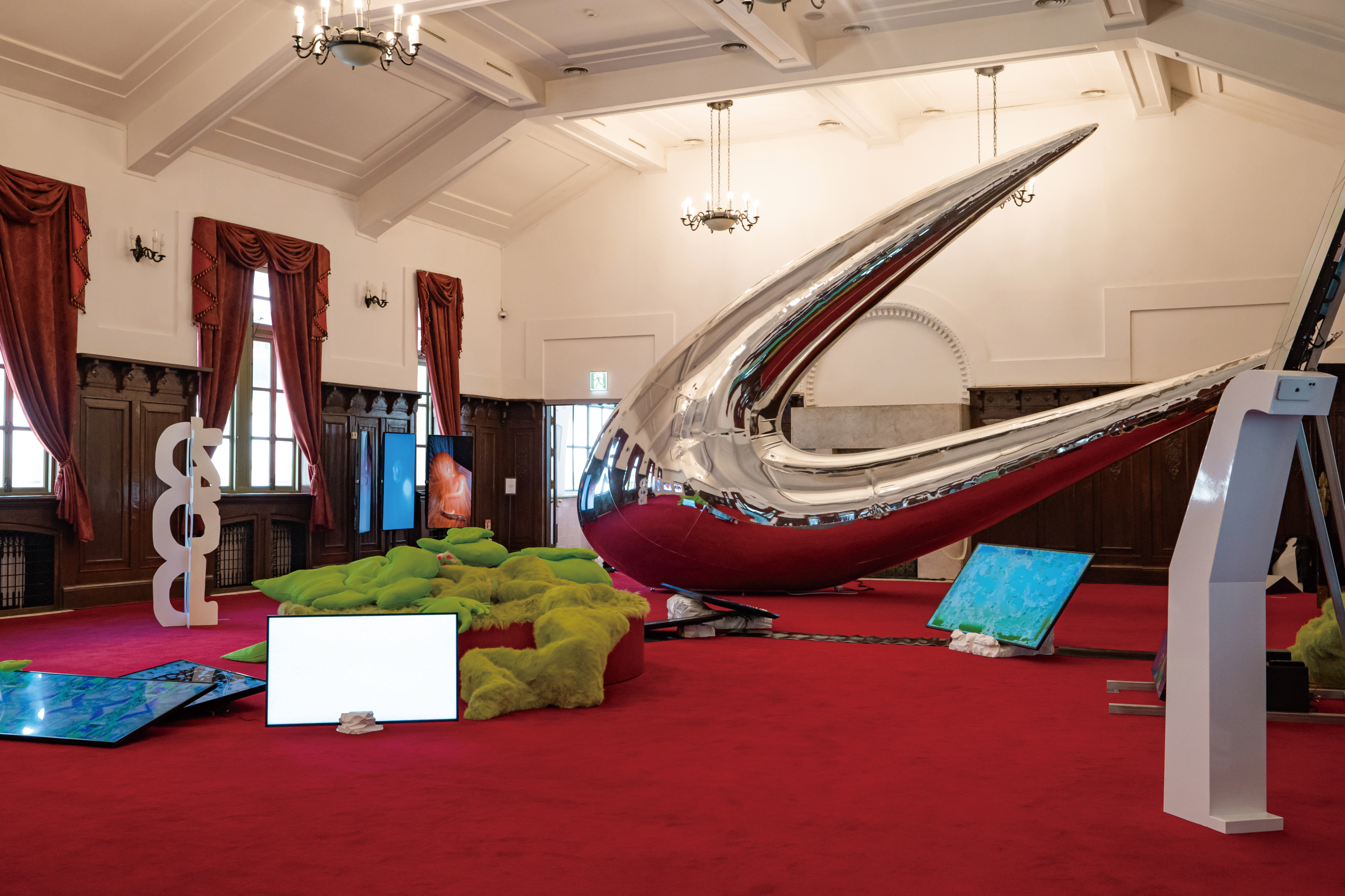 2층에 들어서면 마치 현대미술관에 들어온 것처럼 거대한 설치 작품과 미디어 아트가 공간을 가득 채우고 있다. 밈의 정원으로 마련한 이곳은 인터넷 세상에서 매일 사용되는 기호와 이미지인 밈을 새로운 문자의 영역으로 끌어들인다. 메탈처럼 보이는 거대한 나이키 로고가 가장 먼저 눈에 띄는데, 이는 속도감이 돋보이는 조각을 주로 만들어온 작가 강재원의 작품 ‘스우시’다. 작가는 한정판 스니커즈를 사기 위해 편집매장 앞에서 밤새워 기다렸다 구매하고 이후 한참 부풀려진 가격으로 재판매하는 현상을 유심히 살폈다. 이를 세속적 욕망이 밈처럼 퍼져나가는 것으로 해석한 작가는 속이 텅 빈 풍선을 만들어 허무한 물질주의를 꼬집었다. 이 작품은 반사되는 소재로 되어 있어 가까이 다가가면 관객의 모습이 표면에 비치도록 했다.