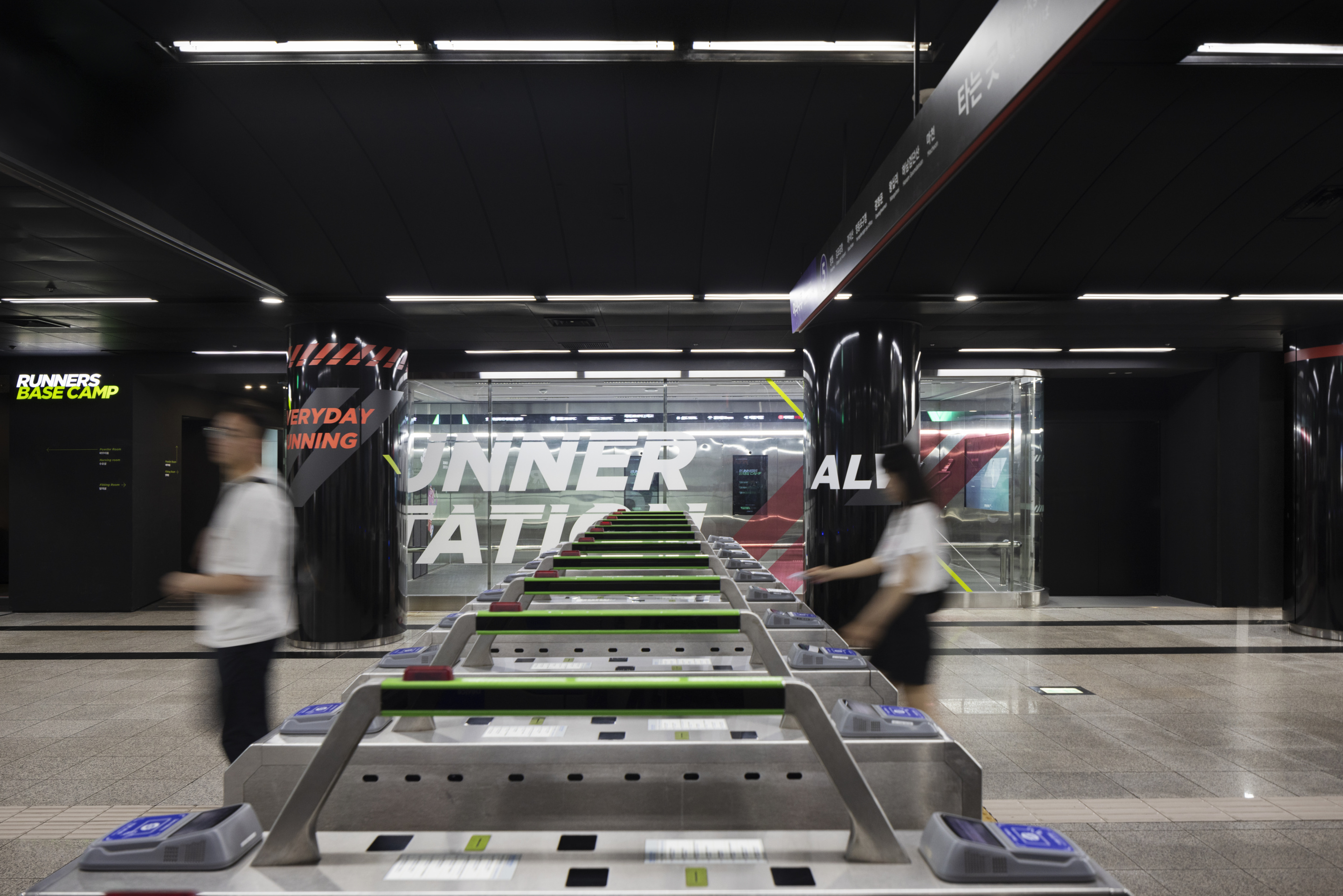 공간 디자인을 맡은 바이석비석은 지하철역이 시민 누구나 이용하는 공공장소라는 맥락에 집중했다. 러너스테이션을 사용하는 러너뿐 아니라, 지하철역을 일상적으로 드나드는 이들에게도 유익한 공간을 디자인하는 게 목표였다. 기획 단계부터 러닝 전문가와 협업해 러닝 활동에 필요한 기능과 콘텐츠를 도출하고, 기존 지하철역의 톤앤매너를 크게 해치지 않는 선에서 디자인 요소를 더했다. 톤 다운된 검은색 천장과 러닝 트랙을 연상시키는 조명, 벽면과 기둥을 장식한 문구와 패턴은 역동적 이미지로 러너스테이션의 존재를 알린다.