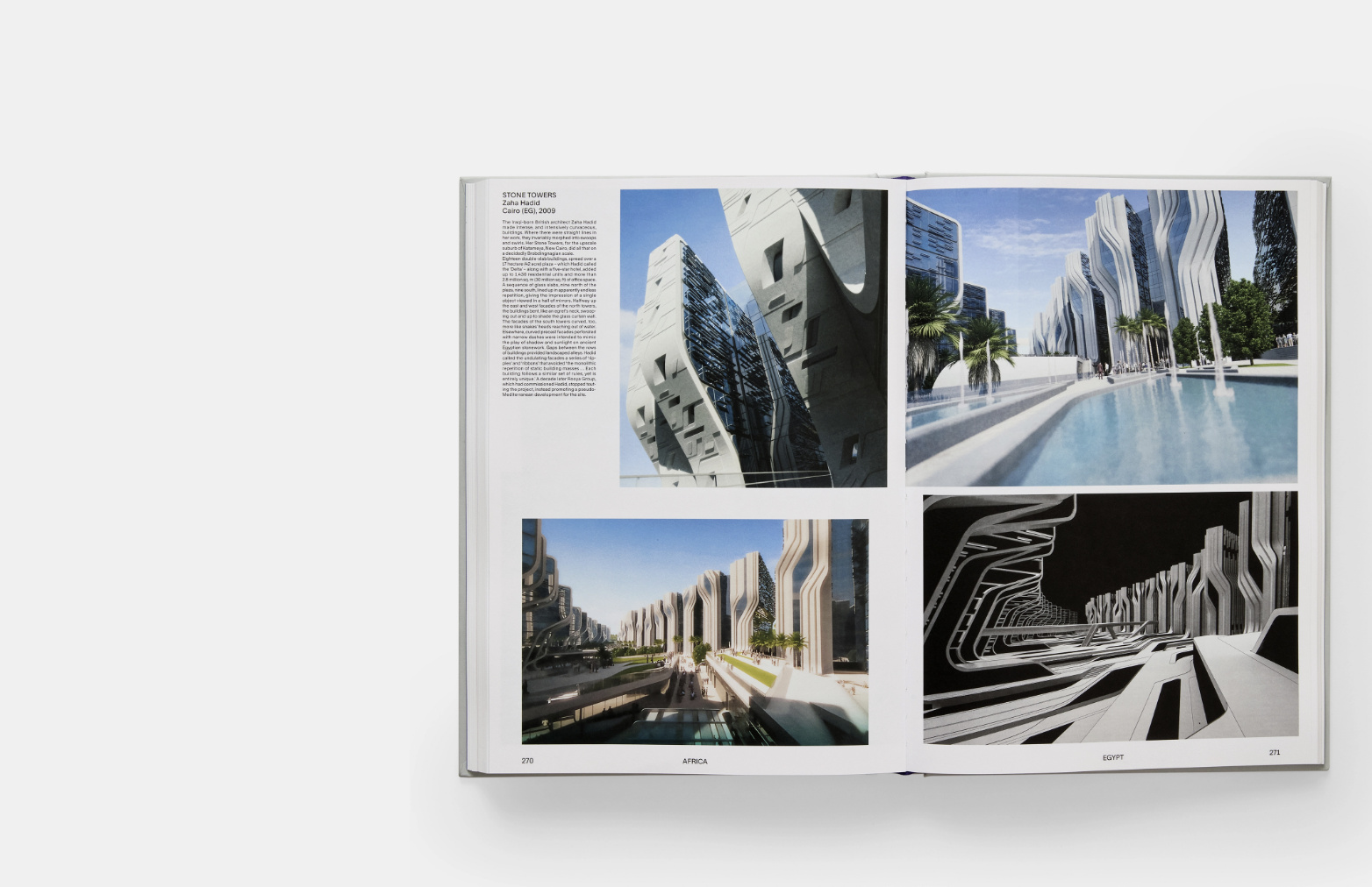 이라크 출신 영국 건축가 자하 하디드(Zaha Hadid)는 2009년 뉴 카이로 외곽의 고급 주택가인 카타메야에 대규모 주상 복합 단지를 만드는 계획에 참여했다. 약 4 에이커의 거대한 부지에 5성급 호텔, 아파트, 오피스 건물들 18개동이 들어서는 계획이었다. 하디드는 생전에 이 ‘스톤 타워스’에 대해 “고정된 건물 덩어리들의 획일적 반복”이라고 표현했다. 하지만 책의 저자들은 ‘직선이 있을 법한 곳에 소용돌이치는 강렬한 곡선이 있다’며 이 실루엣이 단조롭기는커녕 독특하며 전복적이라고 평가한다. 곡선의 형태는 고대 이집트 조각의 형상, 그리고 물체가 물에 반사되었을 때 물결의 주름에 따라 휘어져 보이는 모습에서 영감을 얻었다. 몇 년 후 개발업체가 이곳의 테마를 지중해 느낌으로 변경하면서 하디드의 프로젝트는 중단되었다.