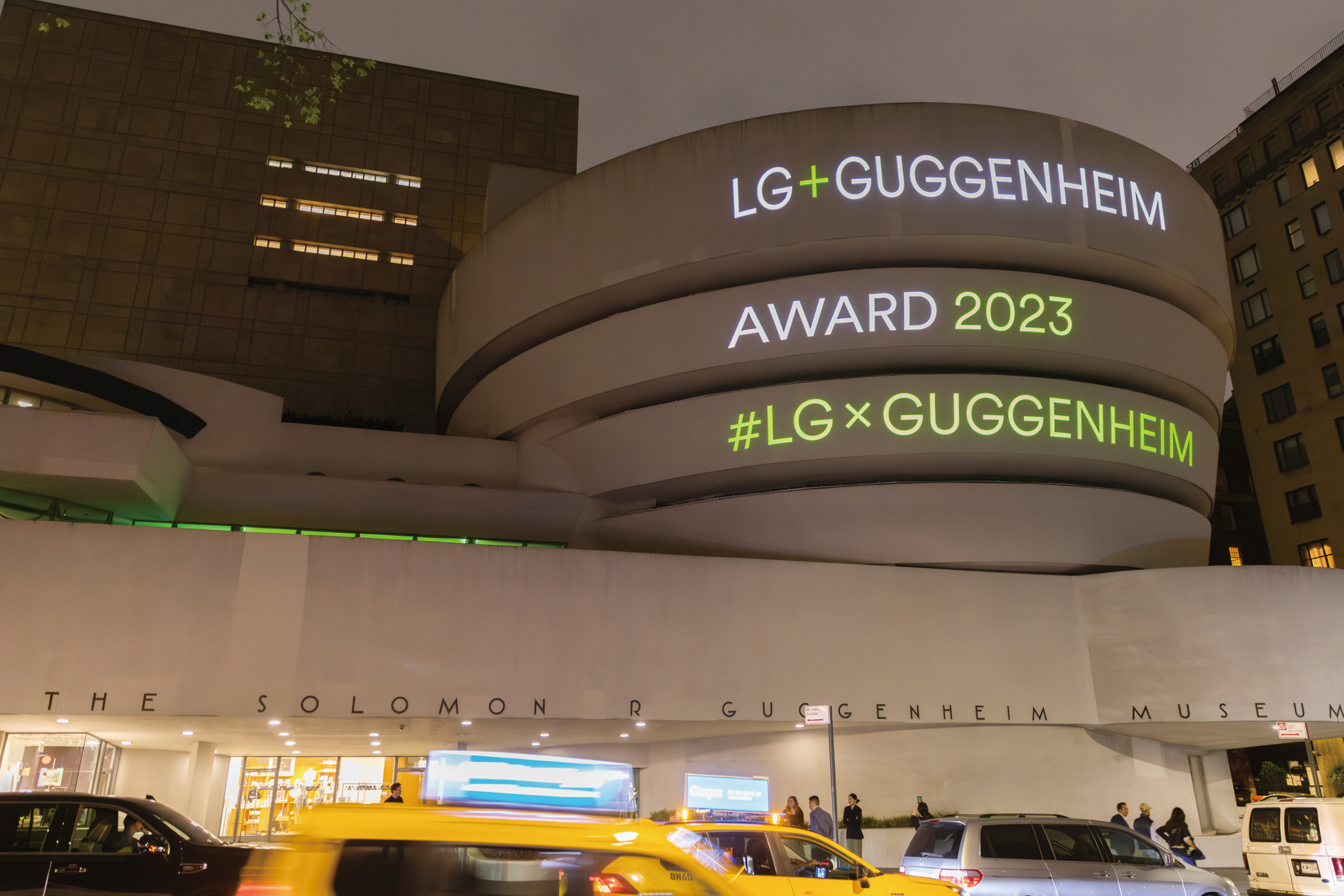 YCC 파티의 소셜 미디어 홍보를 위해 파라 알 카시미의 작품에 로고타이프를 응용한 그리드 시스템을 입힌 영상을 제작했다.LG 구겐하임 아트 앤 테크놀로지 이니셔티브 공식 로고타이프와 LG 구겐하임 어워드 트로피. 트로피는 알루미늄 소재를 CNC로 가공하고 따뜻하고 섬세한 수공 작업으로 마무리하는 과정을 거쳐 완성했다. 트로피 디자인 SWNA뉴욕 구겐하임 뮤지엄 외관에 매핑한 LG 구겐하임 어워드 로고타이프. 사진 Scott Rudd 비주얼 시스템 디자인 Jiminie Ha, Milo Bonacci, Janice Lee, LP Patton