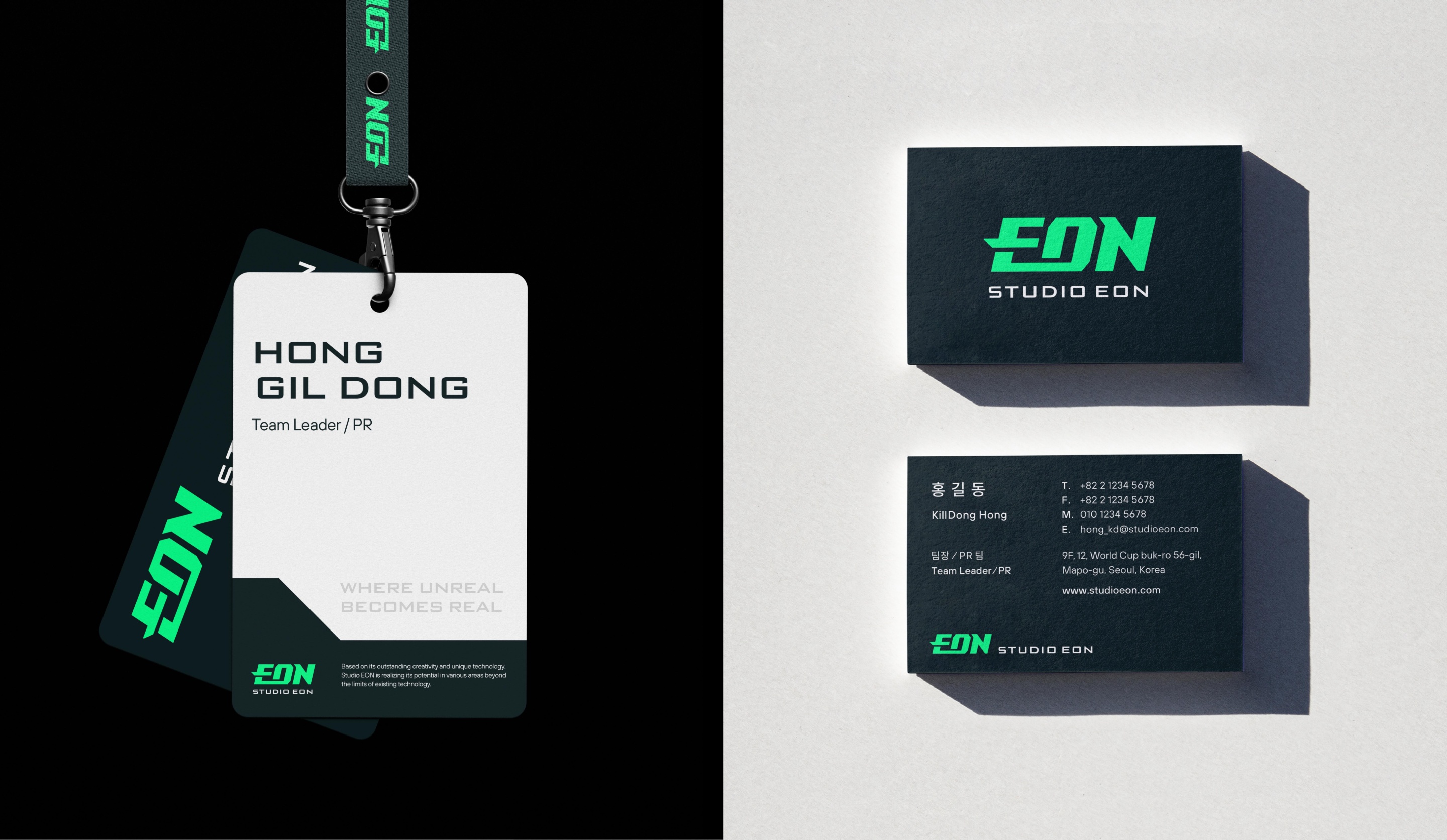 YNL Design은 “WHERE UNREAL BECOMES REAL”이라는 슬로건을 통해 STUDIO EON의 기업 아이덴티티를 새롭게 정의했다. 극단에 있는 “UNREAL”과 “REAL”이라는 두 단어를 함께 사용해 콘텐츠의 잠재력을 실현하는 글로벌 콘텐츠 크리에이티브 스튜디오의 대담한 상상력, 독보적인 기술력, 혁신적인 이미지를 효과적으로 전달하고자 했다. STUDIO EON의 로고는 3D 애니메이션 산업에서의 유산을 차세대 가상 프로덕션으로 연결하는 회사의 탄탄한 역량과 기술을 상징하며, 하단의 획이 하나로 연결된 EON의 로고는 1세대 3D 애니메이션 스튜디오의 헤리티지와 차세대 버추얼 프로덕션을 연결하는 견고한 기술력을 상징하며, 알파벳 ‘E’의 틀을 벗어난 가운데 획은 기존의 한계를 넘어 새로운 가능성을 실현하는 크리에이티브 선구자의 정체성을 표현했다. 사선으로 기울인 로고 바디는 끊임없이 앞을 향해 나아가는 진취적인 태도를 의미하는데, 메인 컬러로는 그린 컬러를 사용해 대담한 상상력을 지닌 크리에이티브 스튜디오의 창의성을 나타냈다.