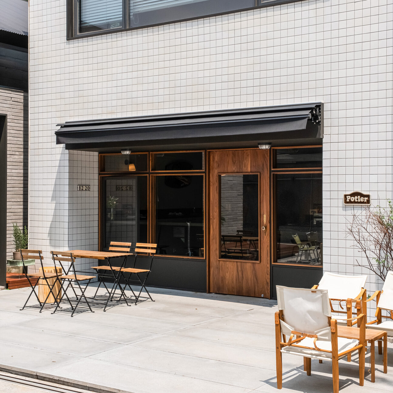 포틀러의 첫 매장은 코사이어티 서울숲점에 둥지를 틀었다. 직원 라운지로 사용하던 공간 일부를 활용했으며, 워크 라운지로 운영하던 공간 또한 포틀러 론칭과 함께 리뉴얼을 준비 중이다. 포틀랜드의 도시와 산장을 모티프로 디자인한 공간은 목재를 주재료로 투박하지만 정제된 인상을 연출했다. 주목할 점은 기존 카페와는 다른 문법을 고수하는 레이아웃이다. 주문과 결제 동선을 분리하고, 그 사이에 스모어를 만드는 과정을 엿볼 수 있는 퍼포먼스 바를 배치했다. 내부는 별도의 좌석 없이 스탠딩 바 테이블로 구성하고, 중정과 이어지는 야외 공간은 도시 캠핑을 연상케 하는 캠핑용품으로 채웠다. 포틀랜드식 스모어를 경험하는 방식을 제안한 것이다.