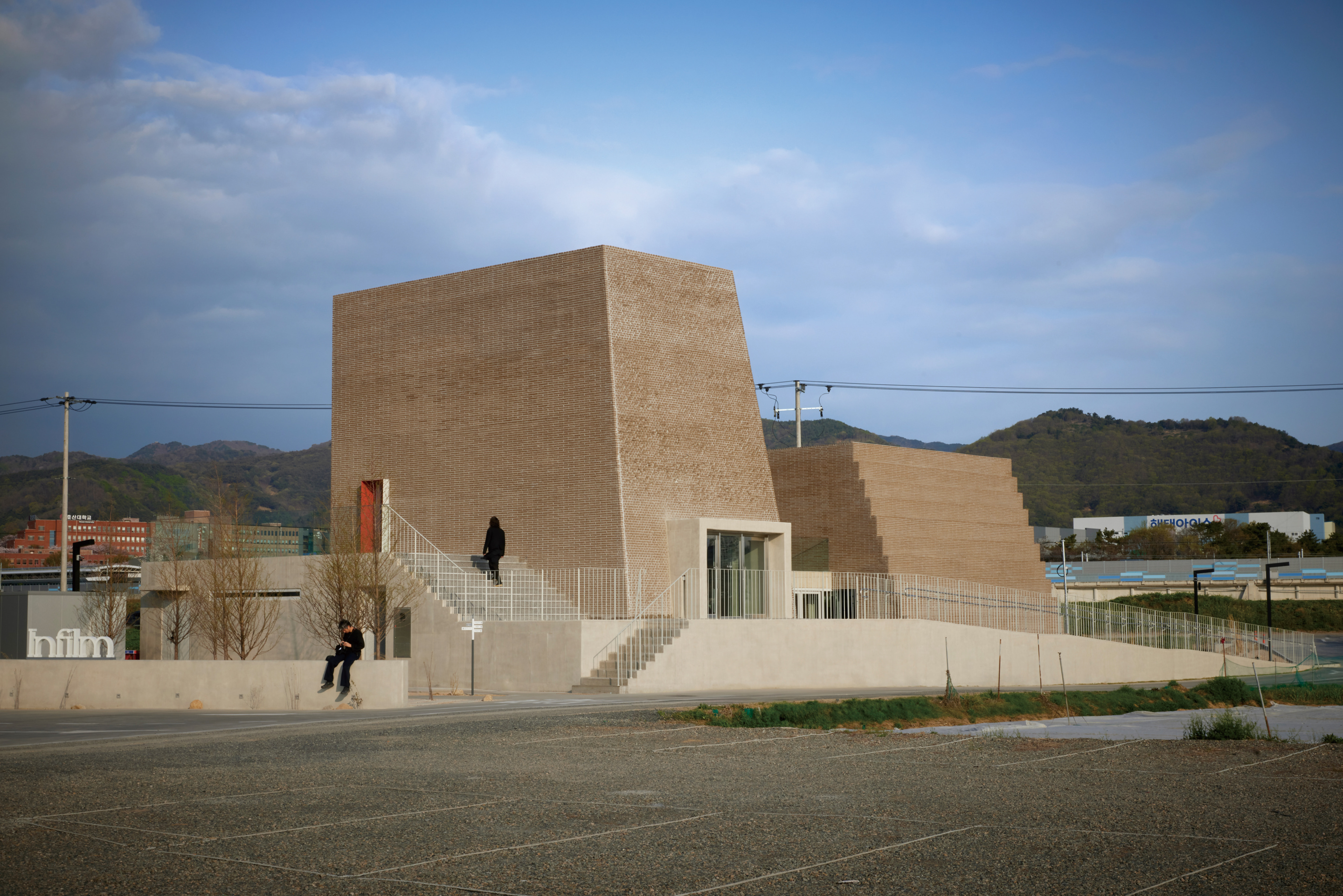 경산의 새로운 랜드마크가 된 카페 ‘인필름’을 방문하기 전에 기억해야 할 네 가지 키워드가 있다. 기차, 걸음, 금호강, 노을이다. 인필름은 금호강 물줄기를 따라 이어지는 길을 면하고 있다. 하지만 디자이너가 이곳에 처음 방문했을 때 마주한 풍광은 예상과 달랐다. 건물이 들어설 곳은 살짝 내려앉은 땅이었고, 자연의 아름다움이 한눈에 펼쳐질 것이라는 기대와 달리 다소 황량하고 산만해 보였다. 디자이너는 이 복잡다단한 문제를 스토리텔링을 통해 극복하고자 했다. 금호강을 따라 지나가는 기차, 둑방에서 산책하는 사람들, 비파 소리가 들리는 강물, 산세를 따라 물드는 노을 등 곳곳에서 발견한 아름다움을 옴니버스식 구성으로 엮어 한 편의 영화 같은 공간을 계획했다. 높은 층고, 세로로 긴 창 등의 요소로 기차역 같은 공간감을 조성하고, 사람들이 자유롭게 산책할 수 있도록 공간 내외부의 길을 연속적으로 계획했다. 강물과 물안개, 떨어지는 빗방울을 연상시키는 수공간, 빛으로 다양한 패턴을 만드는 천창 또한 시네마틱한 순간을 염두에 둔 디자인이다. 만남과 헤어짐이 있는 ‘랜드마크’, 사람과 자연과 도시를 이어주는 ‘길’, 자연의 순리대로 흐르는 ‘물’, 찰나의 아름다움을 담고 있는 ‘노을’을 상상한다면 인필름을 더욱 드라마틱하게 경험할 수 있다.