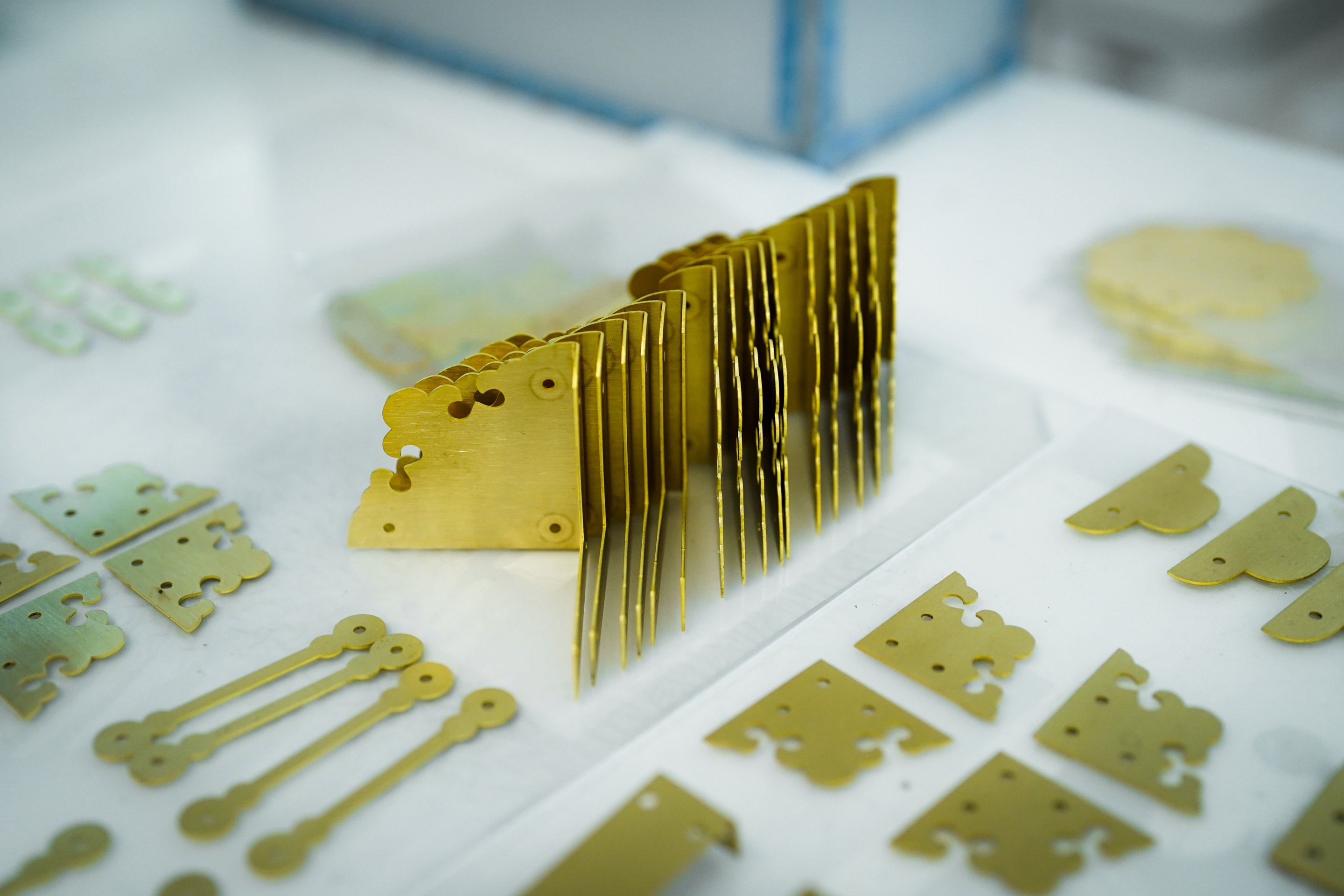 작업 과정을 크게 보면 반은 가구에 서사를 부여하는 일이고, 나머지 반은 제작이거든요. 특히 제작 과정에서 절반 이상을 도면과 도안에 할애하는데 먼저 가구의 틀은 오토캐드(AutoCAD)로 도안을 그려요. 그리고 그 위에 붙이는 작은 장식품들은 손으로 직접 도안을 그린 뒤 일러스트로 벡터화해 데이터 파일로 제작해 두죠. 아크릴이나 장석 등 가구에 사용할 재료를 다룰 때는 CNC 가공과 레이저 커팅을 이용하는데요. 컴퓨터 프로그램을 사용하는 가공법이 주를 이루지만, 이렇게 만들어진 장석을, 열을 줘서 손으로 절곡하거나, 장석 투명도와 내구성을 위해 코팅을 하는 등 생각보다 기계 공정 이후의 수작업이 많아요. 가끔 꼭 김장하는 것 같다는 느낌을 받곤 하는데 공정이 많아서 그런가 봐요. (웃음)