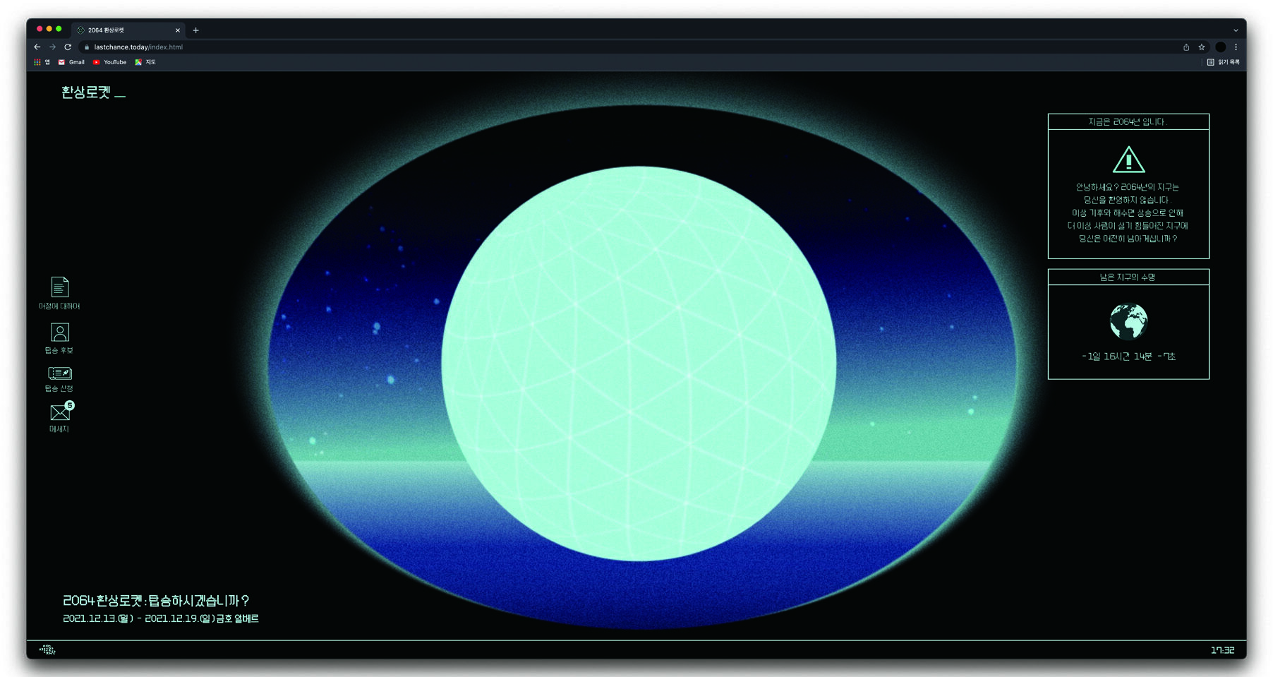 ‘지구의 수명이 1일 3시간 23분 41초 남은 상황, 당신은 두 번째 행성으로 떠나기 위해 로켓에 탑승해야 한다.’ 12월 13일부터 19일까지 금호 알베르에서 열린 전시 〈2064 환상로켓〉의 콘셉트다. 이 전시는 서울문화재단에서 진행한 생활 문화 캠페인으로, 현재의 과도한 생산과 소비로 황폐해진 지구를 미리 ‘재연’하며 기후 위기에 대한 경각심을 환기한다. 관객을 유도하는 방식 또한 흥미로웠다. 전시 정보를 담은 웹사이트에서 ‘탑승 신청’을 클릭해 관람을 예약하고, 직접 관람객이 티켓을 커스터마이징할 수 있게 제작했다. ‘내가 할 수 있는 일은 무엇일까’라고 쓰인 메시지 창에서 한 번 더 환경보호를 위해 실천할 수 있는 일을 생각하게 하고, 이를 그래픽 포스터처럼 꾸며 자칫 지루해질 수 있는 선언의 과정을 흥미롭게 풀어냈다. 이렇게 제작한 탑승 티켓은 실제 전시장의 스크린에 띄워지며 오프라인 전시에서 한 번 더 확인할 수 있도록 했다. ‘당신의 탑승은 거절되었습니다.’ 관람객 전원이 전시의 마지막에 확인하는 문구다. 우리에게 두 번째 지구는 없기 때문이다. 2064년까지는 시간이 좀 남았으니 다행이라고 해야 할까?