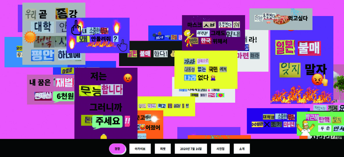 웹사이트에는 100여 건의 시위 사진에서 추출한 600여 개의 단어가 모여 있다. ‘감옥’, ‘광장’, ‘무능’, ‘일본’ 등 손글씨와, 굵은 폰트로 적힌 각양각색의 타이포그래피가 가나다순으로 나열돼 있다. ‘광장’에 접속한 사용자는 잘게 쪼개진 수많은 단어 중에서 단어를 마음껏 고르고 이모티콘 등을 조합해 새로운 피켓을 만들 수 있다. 일본 제품을 불매하자는 메시지, 성범죄 이슈에 대한 외침, 등록금 환불을 요구하는 발언, 때로는 별 뜻 없는 장난스러운 말도 된다. 이렇게 만들어진 ‘광장’은 과거부터 현재까지 지속되어온 시위 문화를 연장하고 오늘의 방법을 제시한 것이다.
