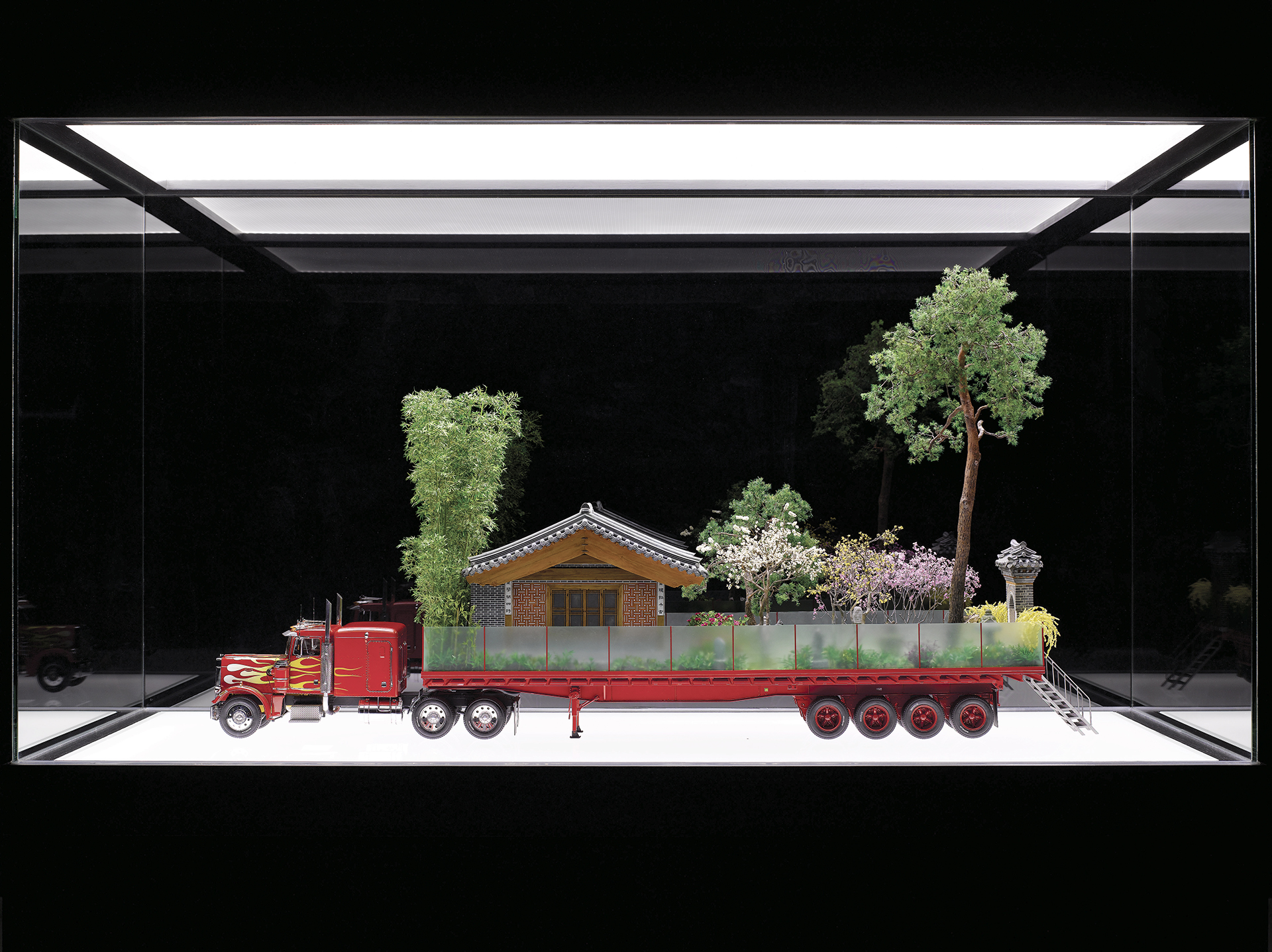 3D 건축 모형 작품 ‘연결하는 집, 런던’은 영국 런던의 웜우드 스트리트의 육교에 한옥 모형을 심은 작품을 축소했다. 이방인으로서 이주하는 과정에서 느낀 기억과 감정, 이민의 역사 그리고 문화 충돌 등에 대한 자기 생각을 담았다. 어린 시절 살았던 집과 정원을 16분의 1 크기로 줄여 제작한 ‘비밀의 정원'(2012)도 같은 맥락이다. 특히 이 작품에서는 18륜 트럭 위에 집과 정원이 실려 있는데 이는 미국적인 풍경을 상징하며 작가가 지냈던 한옥집과의 대조적인 풍경을 자아낸다. 이번 전시에서 처음 소개하는 작품도 눈길을 끈다. 신작 ‘나의 집/들'(2024)은 서도호 작가가 그간 지내온 집과 작업실 공간을 축소해 하나의 건축 모형 설치물로 만든 것이다. 과거 자신의 공간들의 파편을 한데 모은 작품은 이방인의 삶을 살아온 작가의 또 다른 초상화로서도 기능한다.
