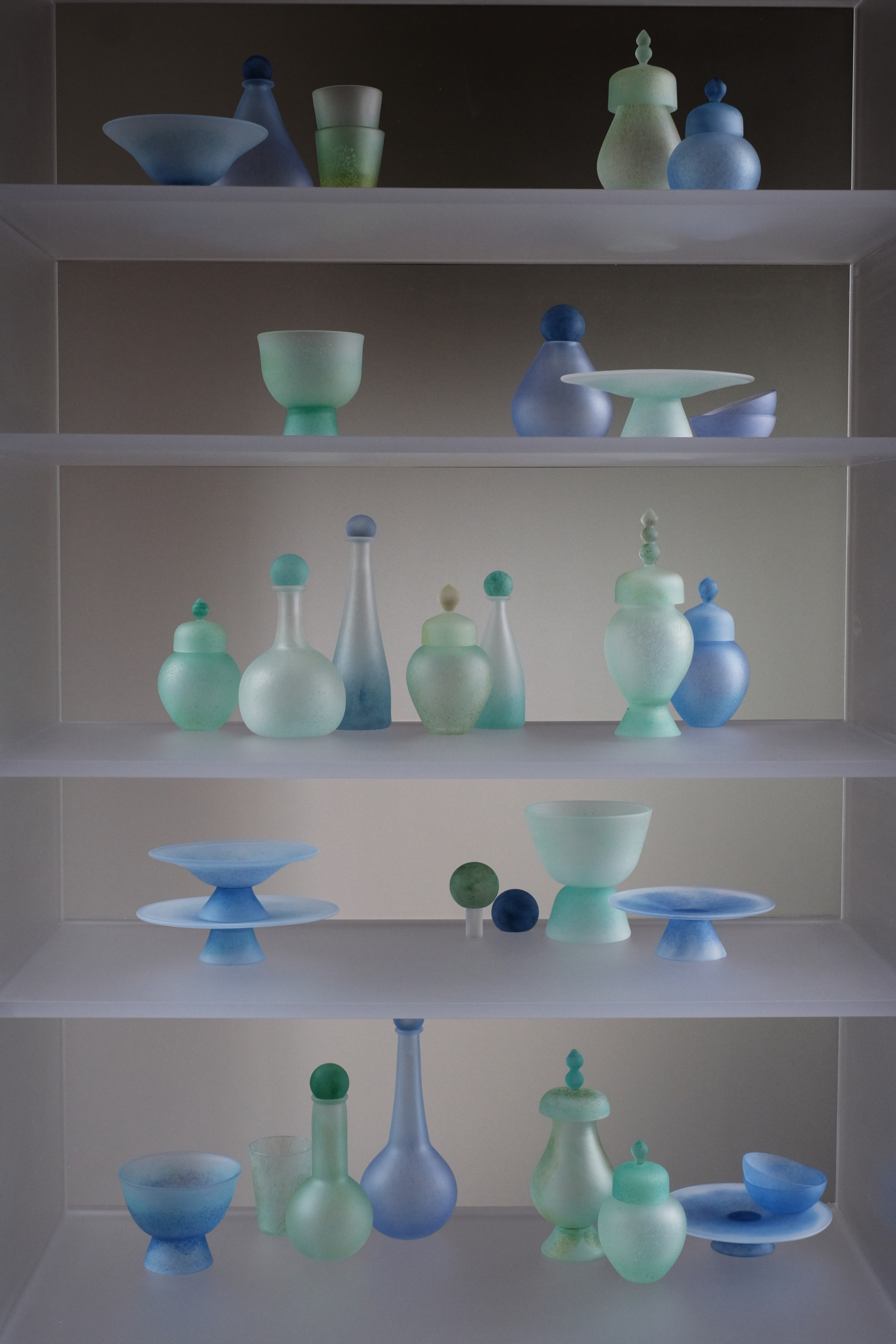 유물이 아주 오랜 시간 땅속에 묻혀 있는 동안 풍화작용을 겪게 되잖아요. 비도 오고, 눈도 오고, 바람도 불고 자연의 시간을 거쳐 부식이 되는 동안 바랜 유리 겉면의 질감과 패턴을 일반적인 공예의 재료인 프릿(Frit)과 파우더를 사용해 표현한 거죠. 또 이번 전시 작품 대부분이 초록색과 파란색인데 이는 고대 유물을 오마주한 컬러에요. 그 당시 유리 제품을 보면 안료가 한정되다 보니 색이 거의 다 비슷했거든요.